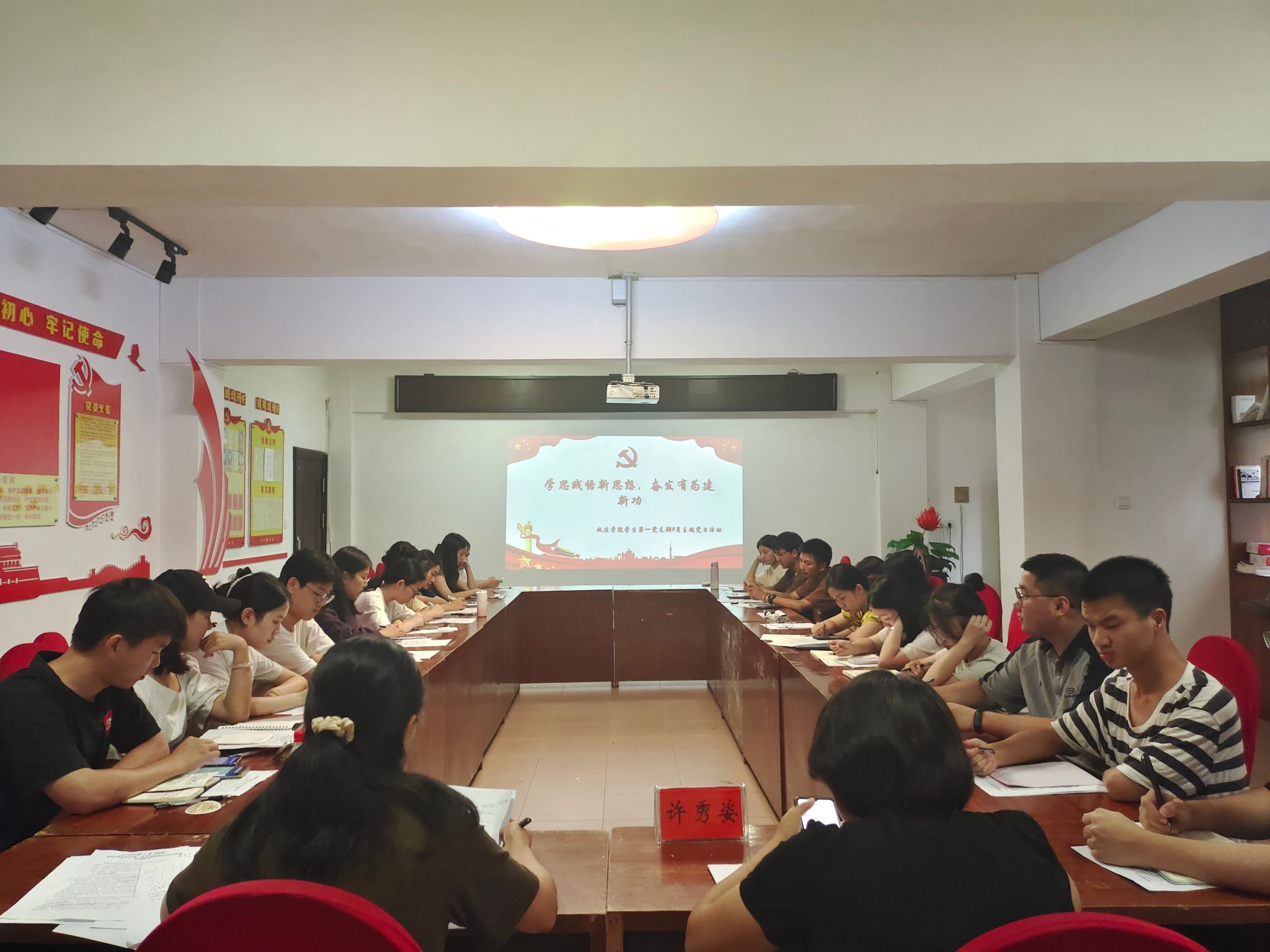 为深入学习贯彻习近平新时代中国特色社会主义思想,2023年9月7日下午,政法学院学生第一党支部在19栋党员活动室召开了“学思践悟新思想,奋发有为建新功”主题党日活动。