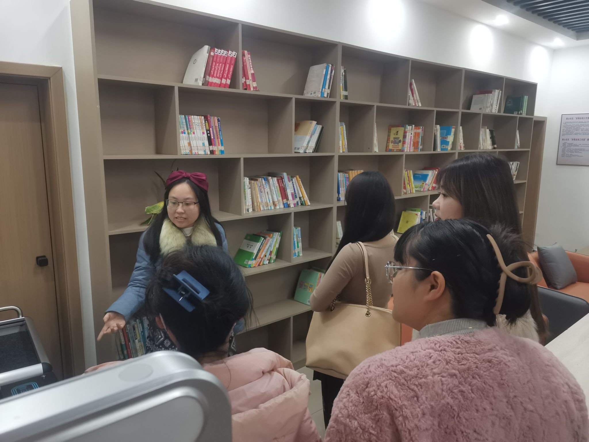 其次,大家还参观了社工为服务对象进行访谈治理的区域,非常注重服务对象隐私,环境温馨而令人放松,让同学们身临其境感受到社工价值观的实际运用。在阅读区,同学们手捧图书一本,陶醉在书香之中。王晶介绍道:在社区借阅的图书在吉安市区的各大图书馆均可归还,这极大地便利了社区街道的居民们的学习。