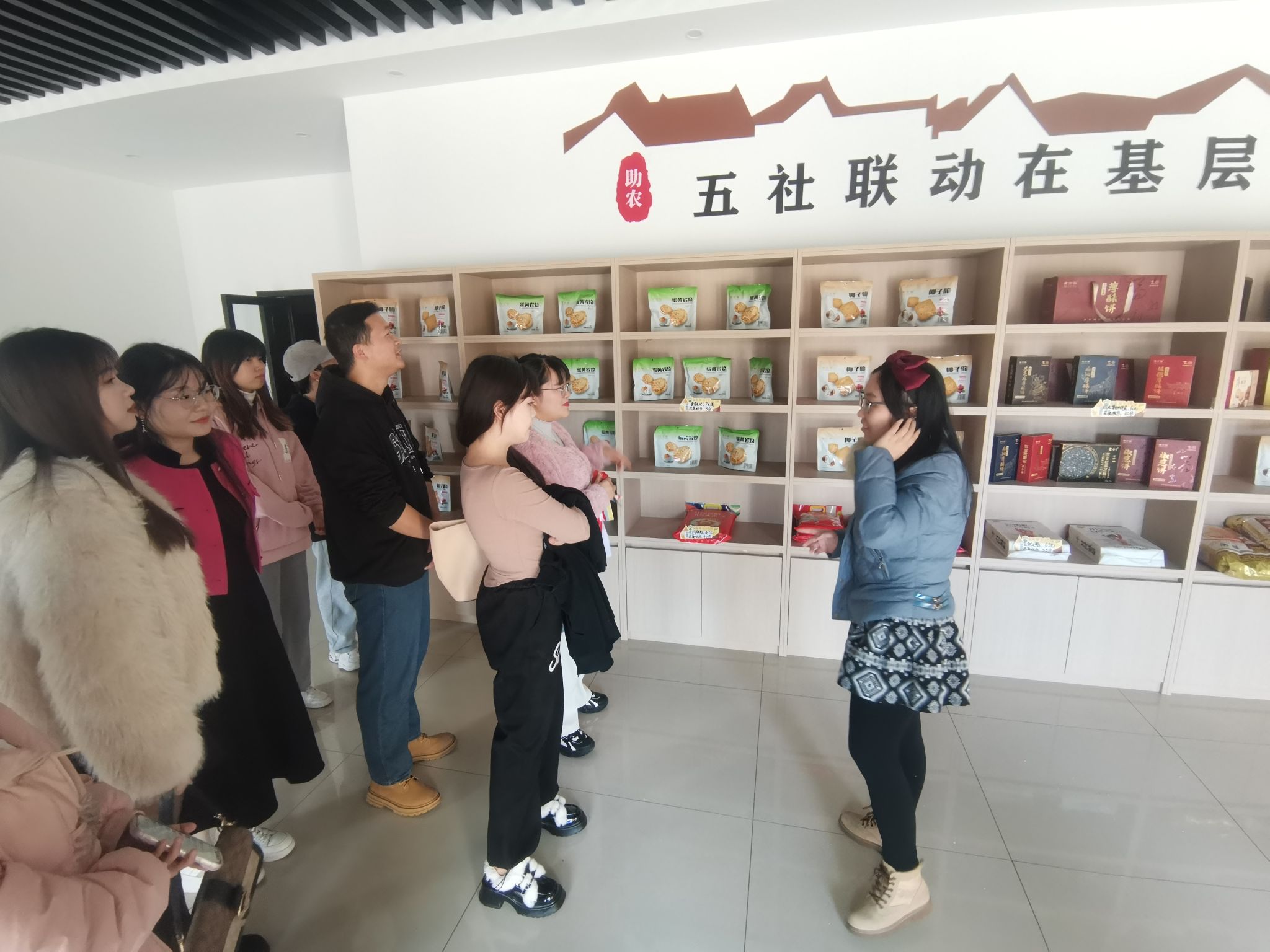 首先,社区工作人员王晶带领大家参观了五社科联动板块,向同学们介绍了五社联动在基层的社工站项目:青原好物直播,主要的产品有井冈蜜柚、大米等扶贫助农产品,并且链接了相关民政、劳动保障局等资源定期为社区居民开展直播课程,增强就业能力。同学们从社工站的赋权、增能方法的运用、资源链接效率中受益匪浅。