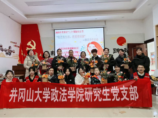 三月春风暖,花香满社区。为庆祝 “三八” 国际妇女节 115 周年,丰富社区女性业余文化生活,展现新时代女性的优雅自信,倡导积极向上的生活态度,3 月 8 日上午,河东街道梅苑社区党支部携手井冈山大学政法学院研究生党支部,成功举办了 “花艺悦生活,把爱送回家” 主题插花活动。