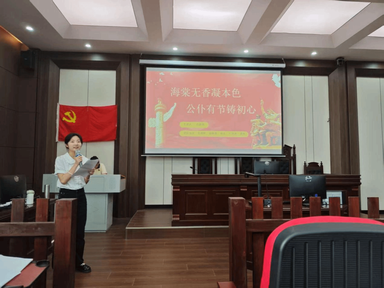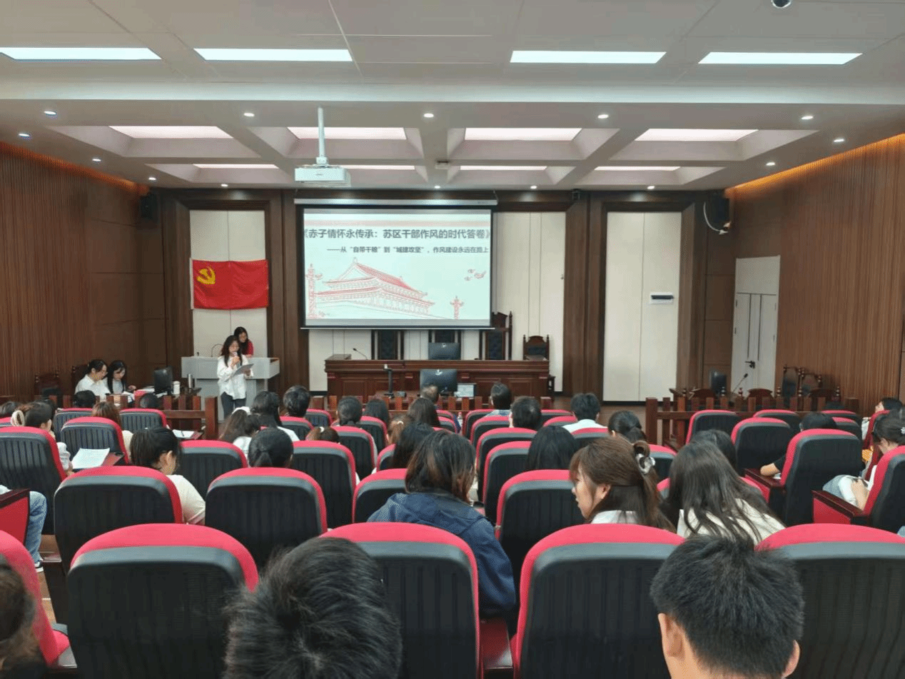 为深入贯彻中央八项规定精神学习教育,引导党员锤炼过硬作风、强化使命担当,2025年5月29日,由政法学院党委主办、政法学院学生第一党支部承办的“党史中的好作风”讲故事比赛在五栋408教室顺利开展。政法学院党委副书记喻聪,学生第一党支部书记杨婷,辅导员助理严俊辉、周玟担任评委,政法学院全体学生党员和入党积极分子积极参与。