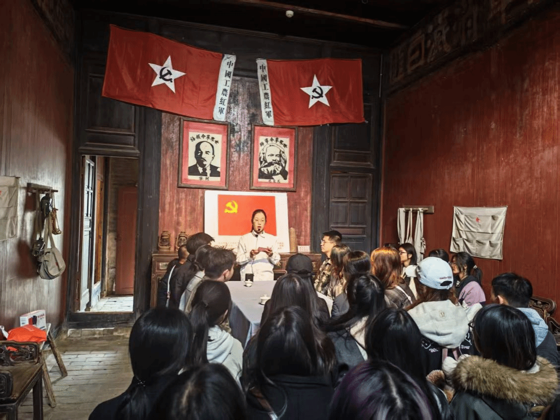 同学们穿过古街,驻足在永慕堂前。南宋梁氏宗祠内,红石牌楼与八十八根石柱相映,斑驳的墙面上红色标语透露着历史的痕迹。讲解员结合沙盘还原朱德、陈毅部署战役的场景,同学们看着柱上弹痕,体悟着“军民团结”的斗争智慧。随后,同学们跟着讲解员的脚步来到古村深处的“二七”会议旧址。讲解员在这里详细讲解了毛泽东主持会议通过“二七”土地法的历程,让同学们读懂“没有调查就没有发言权”的实践源头,引导同学们今后遇事更要多调研、重实际。将军馆内,“一座古村走出五位将军”的光辉事迹震撼人心。同学们深受触动,纷纷表示将以先辈为榜样,用实际行动扛起当代青年的时代使命。