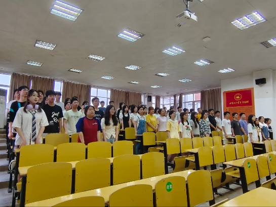 首先,全体起立奏唱国歌。主讲人黄玉洁从学习习近平新时代中国特色社会主义思想切入主题,接着从 “十个明确”、“十四个坚持”、“十三个方面成就”三个方面概括了习近平新时代中国特色社会主义思想的主要内容。同时,借助短视频的方式告诉同学们要从实践学习中寻找解决现实问题和困难的解决经验和办法。最后,黄玉洁通过提问的方式让同学们回忆会议内容并加深记忆。活动在嘹亮的团歌声中结束。