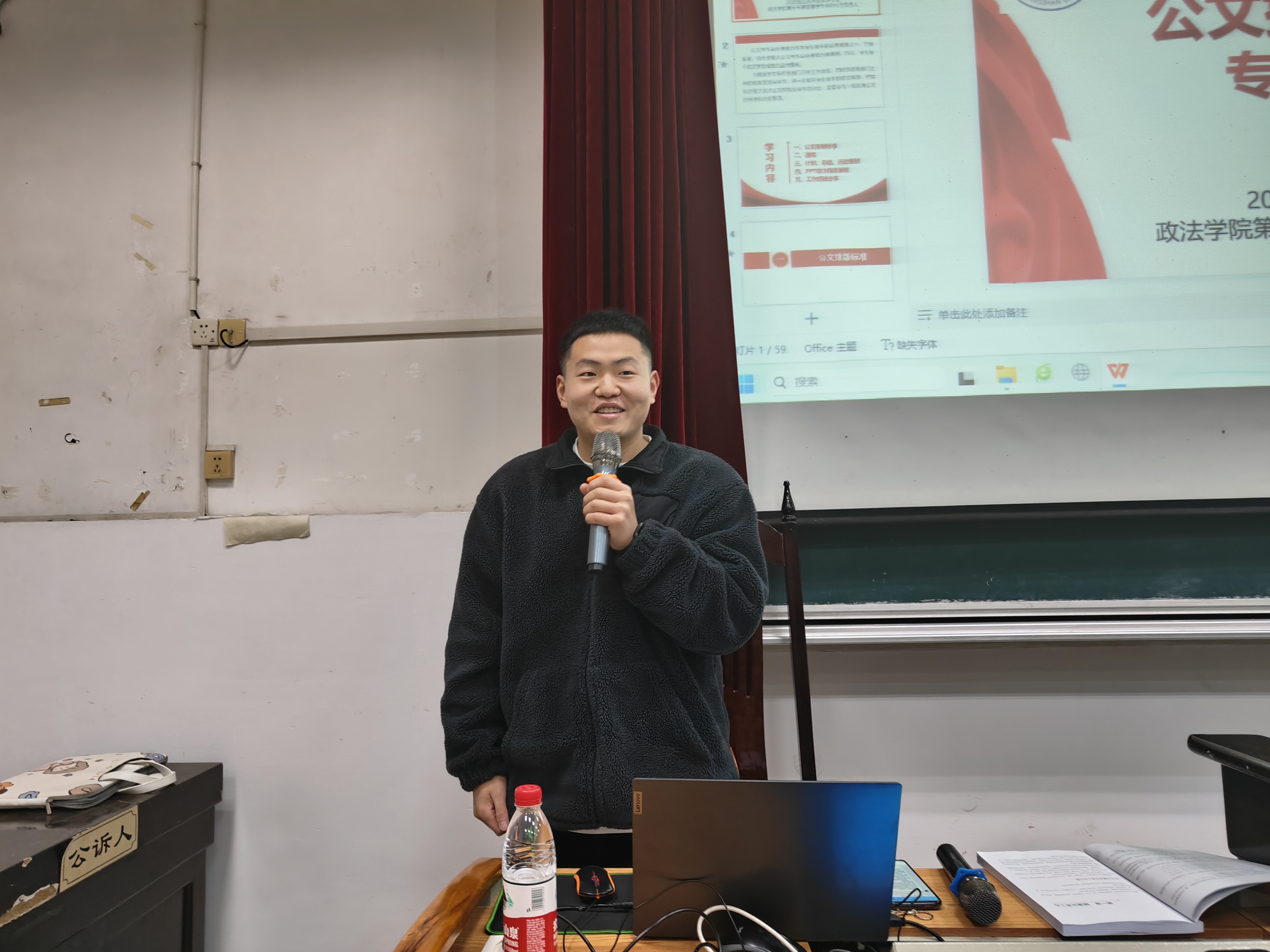 为了提高学生会成员的公文写作能力及办公软件应用能力,政法学院学生骨干培训班于3月27日18时30分在五栋408教室开展“学生骨干文书写作及办公软件应用培训”讲座,第15届政法学院团委办公室负责人张志同担任本次讲座的主讲人,全体学生骨干培训班学员参与。