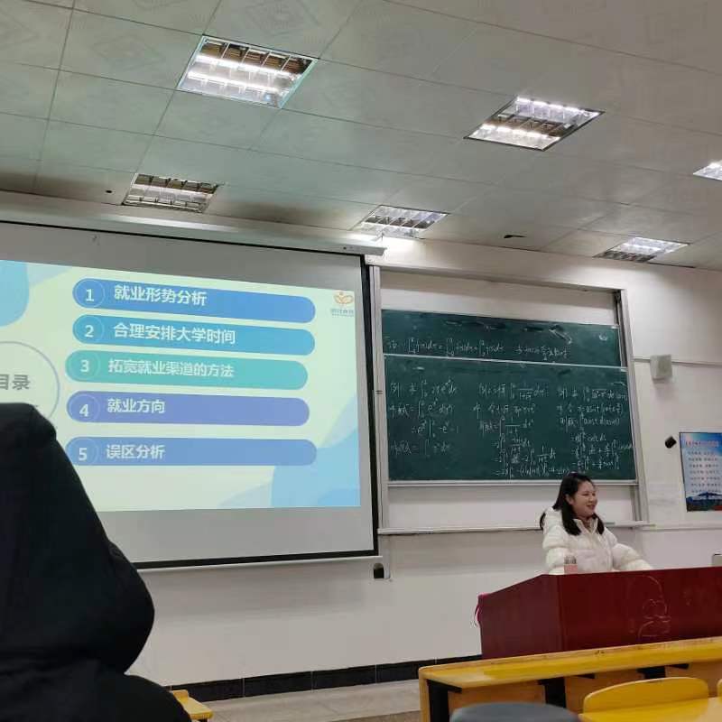讲座上,老师首先向同学们介绍了当前严峻的就业形势:高校毕业生人数逐年增加、疫情形势不明朗、企业裁员或破产等,并告诫同学们要合理安排大学时间,充分利用在校期间学好专业知识以及职业技能。然后,老师分别从性格、兴趣、自我认识等维度告诉同学们如何确定最优职业目标和拓宽就业渠道。最后,老师分析了普遍大学生对就业形势的误区,并为大家进行了答疑解惑。