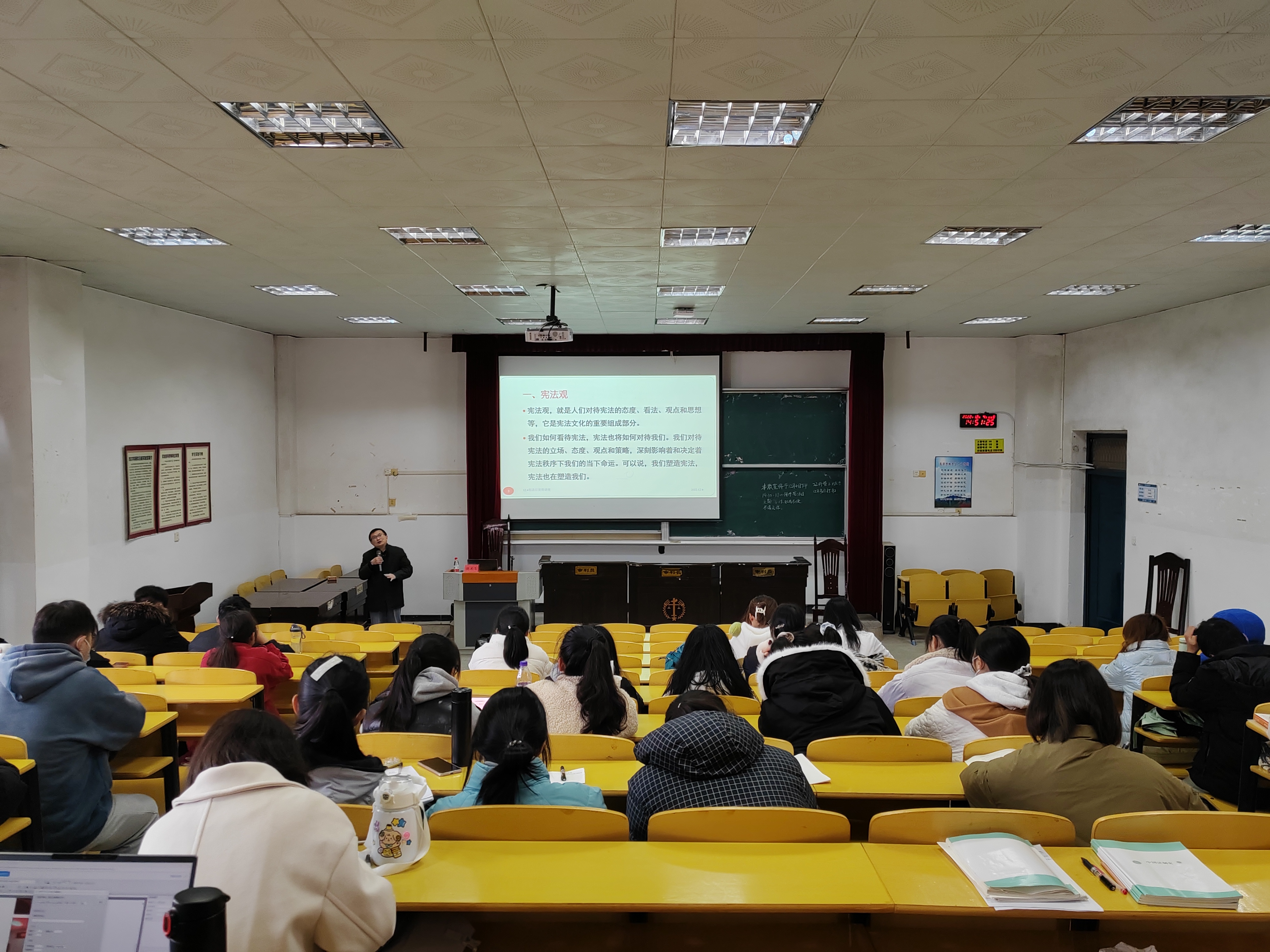 为向我院学生普及宪法知识、弘扬宪法精神、树立宪法权威,12月4日下午2时30分,我院于5栋408室开展宪法日主题活动讲座。学院教师饶龙飞博士担任本次讲座的主讲人,政法学院21及22级法学班部分学生参与聆听本次讲座。