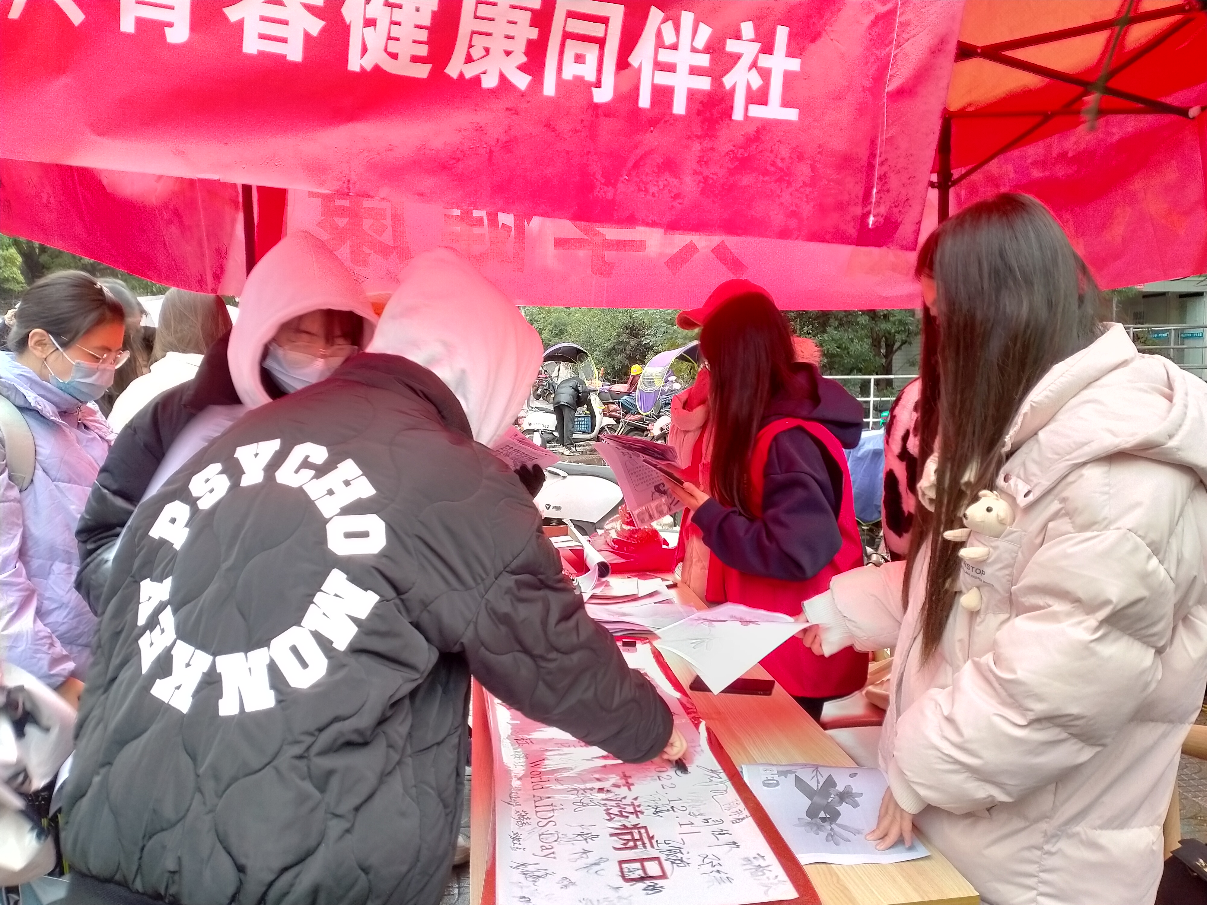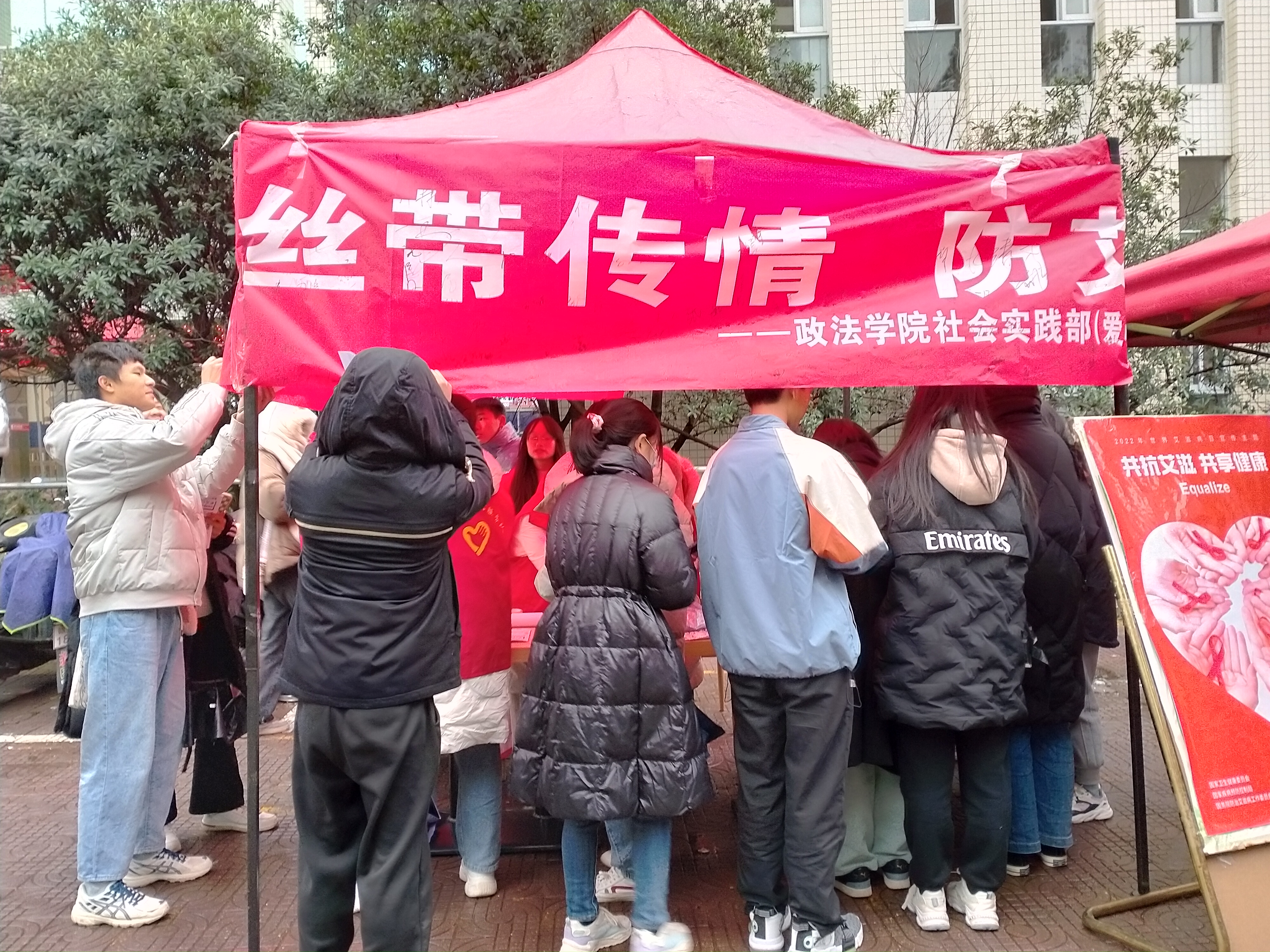 为宣传防艾知识,提升大学生对艾滋病的防范意识,12月1日上午11时30分,政法学院学生会社会实践部(爱心社)联合青春健康同伴社在南区一食堂共同开展“丝带传情,防艾同行”防艾主题活动。