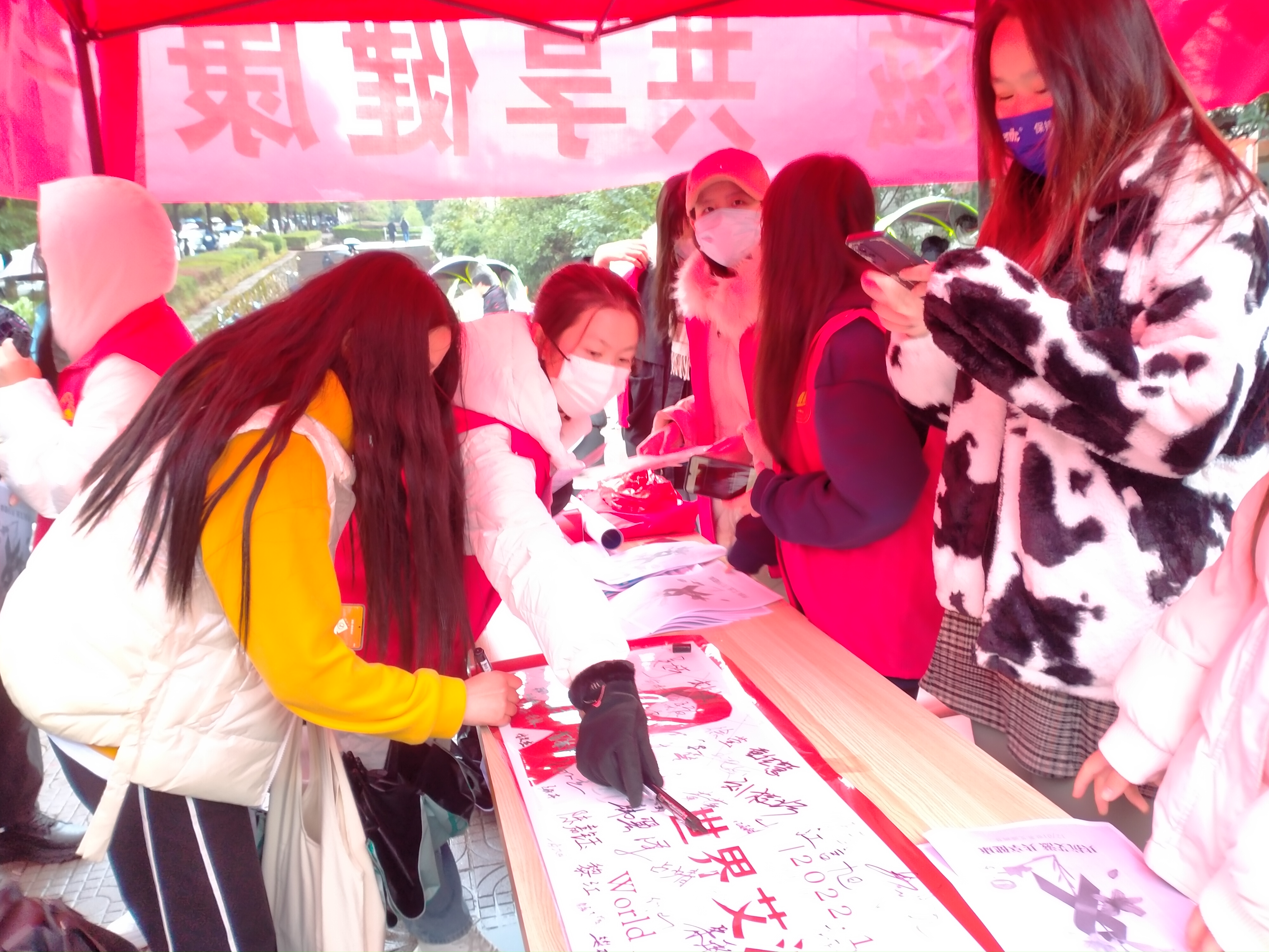 活动开始,志愿者们进行活动介绍并积极向同学们宣传防艾知识。宣传过程中,志愿者们为参与同学发放防艾物资,并动员参与成员在横幅上签名留念、写祝福语。活动以同学们的笑容收尾,虽然是寒冷的雨天,同学们依然感受到了志愿者们的热情,并带着这份爱心将关怀传递。最后,志愿者们统一合影留念,纪念活动风采。