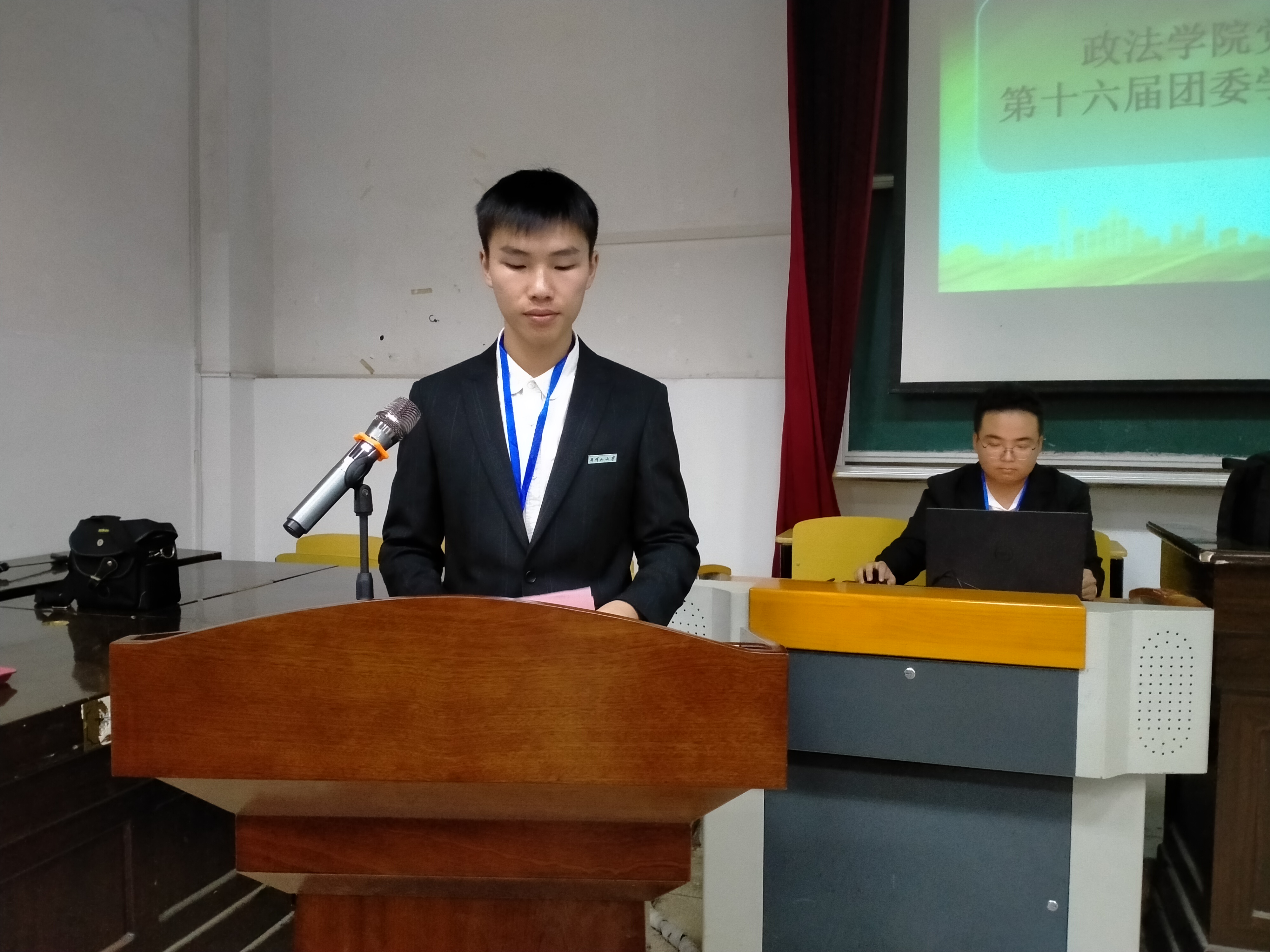在喻聪宣布第十六届团委学生会工作人员试用名单之后,政法学院第十六届团委学生会学生骨干代表范想发言与大家共勉,他简单回忆了过去一年自身的成长与改变,并鼓励第十六届团委学生会工作人员时刻牢记团委学生会为同学们服务的宗旨,平衡学习与工作,永葆青春之理想,秉承优良传统,创新工作模式,用奋斗铸就明天的辉煌。大会尾声,全体人员进行合照留念。