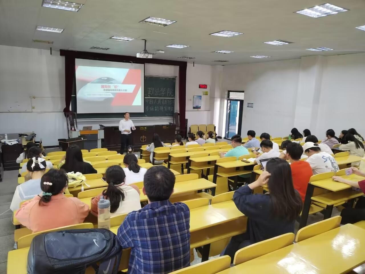 会上,赖东升询问了同学们的近期目标和就业方向之后,从自己的工作经历出发,为同学们阐述了不懈奋斗的精神意义。随后,赖东升围绕扶“职”主题,为同学们讲解了公司的企业概况、薪资待遇、业务分类以及发展优势等,让同学们对中国人寿这一企业有了更深入的了解。会议尾声,赖东升对同学们的询问一一做出答复,鼓励其树立正确的择业观,做好长远职业规划,引导他们理性看待就业形势,把握政策导向,转变就业观念。