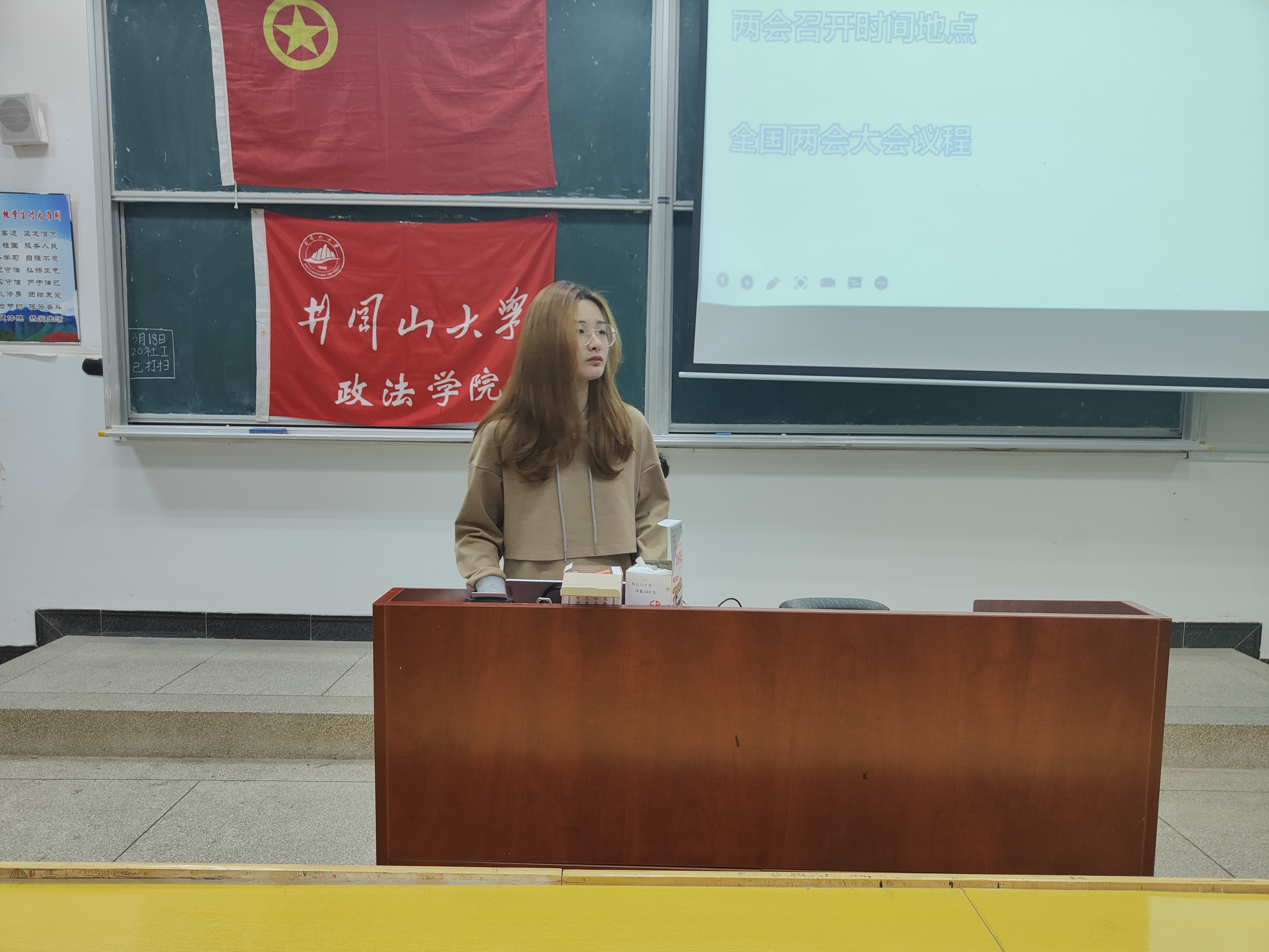 活动伊始,全体起立奏唱中华人民共和国国歌。本次团日活动对全国两会主要从三个方面来展开:一是熟知两会;二是聚焦两会提案议案;三是世界看两会。团课利用短视频和问答等方式向同学们详细地介绍了两会召开时间、大致流程以及目的和意义,带领同学们从浅至深的认识两会、走进两会并聚焦两会热点与议案,讲解范围不仅仅立足于国内,还放眼于国外,让同学们更加清晰的认识到两会对世界同样有重要意义。团日活动的最后,全体共唱中国共青团团歌。