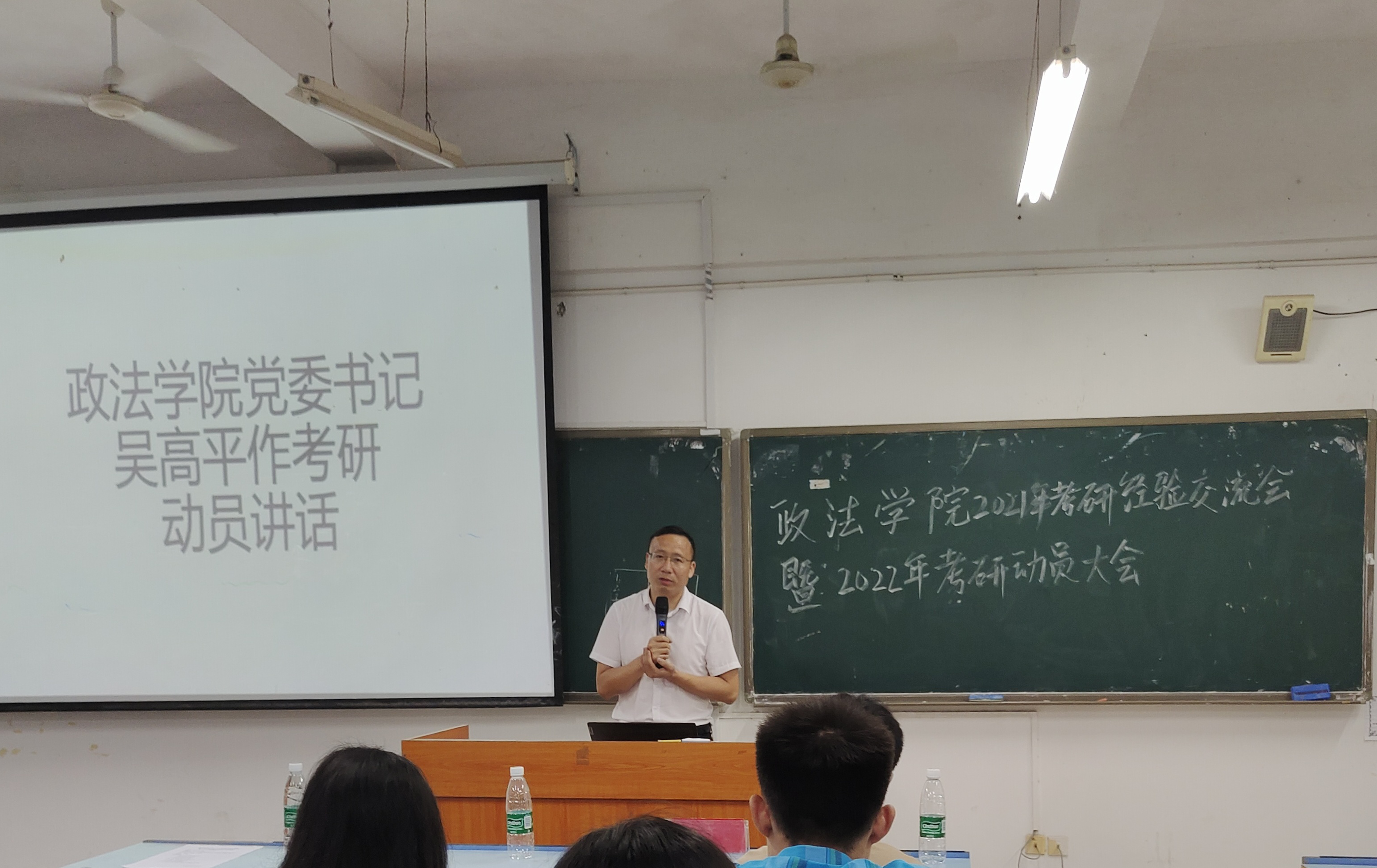 为营造浓厚的考研氛围,保持良好的考研风气,使学生能够更好地了解和掌握未来考研的趋势、备战考研,5月13日晚6时30分,政法学院于10栋A001室开展2021年考研经验交流会暨2022年考研动员大会。政法学院党委书记吴高平,辅导员肖文海出席此次会议。