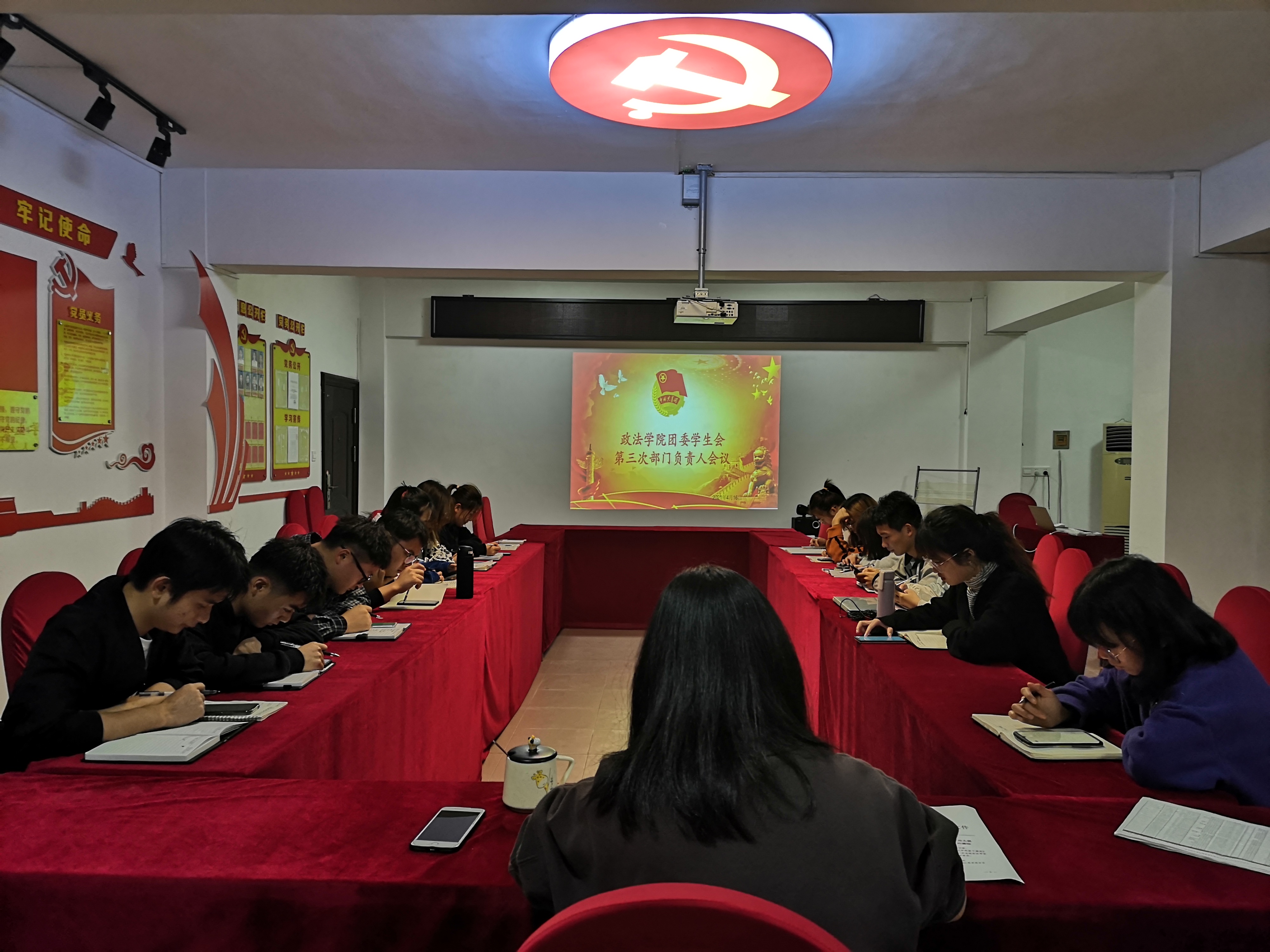2021年4月16日晚6时,政法学院召开团委学生会工作培训会暨工作部署会,政法学院团委书记、学生科科长杨婷出席会议,政法学院团委学生会成员到场参加。