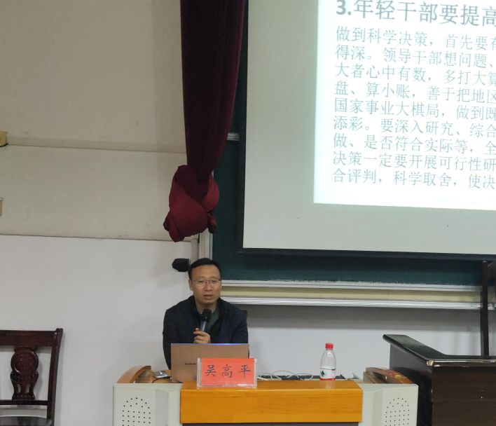 吴高平以“提高解决实际问题的能力”为题,从问题意识与干事的关系、需要增强哪些本领、解决问题的能力有哪些、如何提高解决问题的能力四个方面进行讲解,他用“增强问题意识、提高解决实际问题能力、真刀真枪锤炼能力”解读习近平总书记提出的“年轻干部要‘想干事、能干事、干成事’”,并勉励学员要增强八大本领、提升解决问题的能力。最后,他教育大家要牢记初心使命,坚定理想信念;加强学习,克服“本领恐慌”;深入人民群众,汲取智慧力量;加强自身实践锤炼,经历风雨。