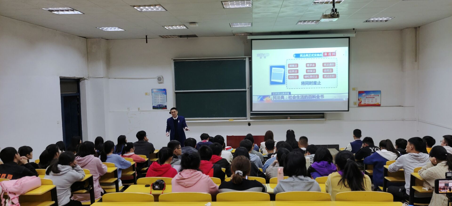 智桥律师事务所张小兵律师以“民法典时代法科学子成长之路”为主题,从民法典时代法科学生成长目标、大学法科教育的优势和不足、大学法科学生的成长建议三个方面进行讲授,最后张律师呼吁同学们在民法典时代要抓住时代脉搏顺势而为。随后,19法一班的徐靖宇和戴紫欣、20法一班的饶智璇等三位学生代表向同学们提出了如何深入学习法律知识,提高本专业学习效率的建议。现场提问环节,同学们就法学专业学习、就业方向等方面提出自己的疑问,张律师用通俗易懂,幽默风趣的语言为同学们一一解答,现场气氛活跃,活动圆满结束。
