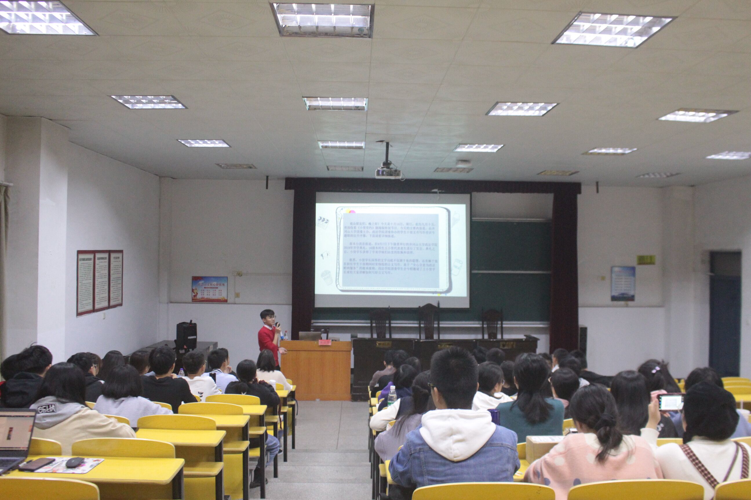 为增强学生干部的文书写作能力,提高其综合素养,使其更好地起模范带头作用,11月15日晚6时30分,我院于5栋408室特邀第十二届学生会主席王志贤进行“学生干部文书写作培训”讲座。我院团委学生会全体成员到场参加此次讲座。