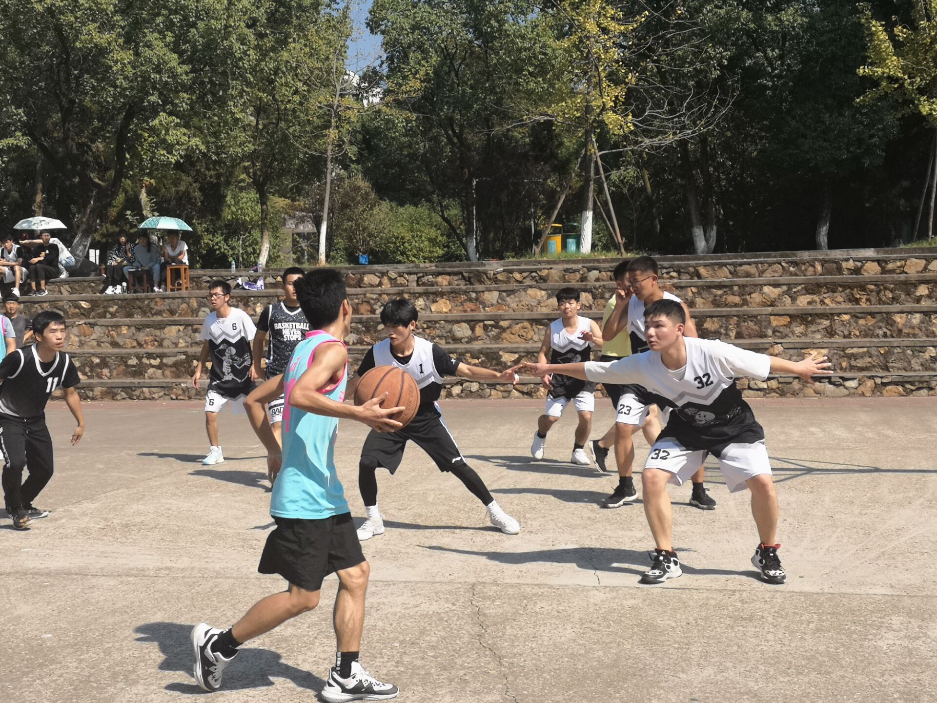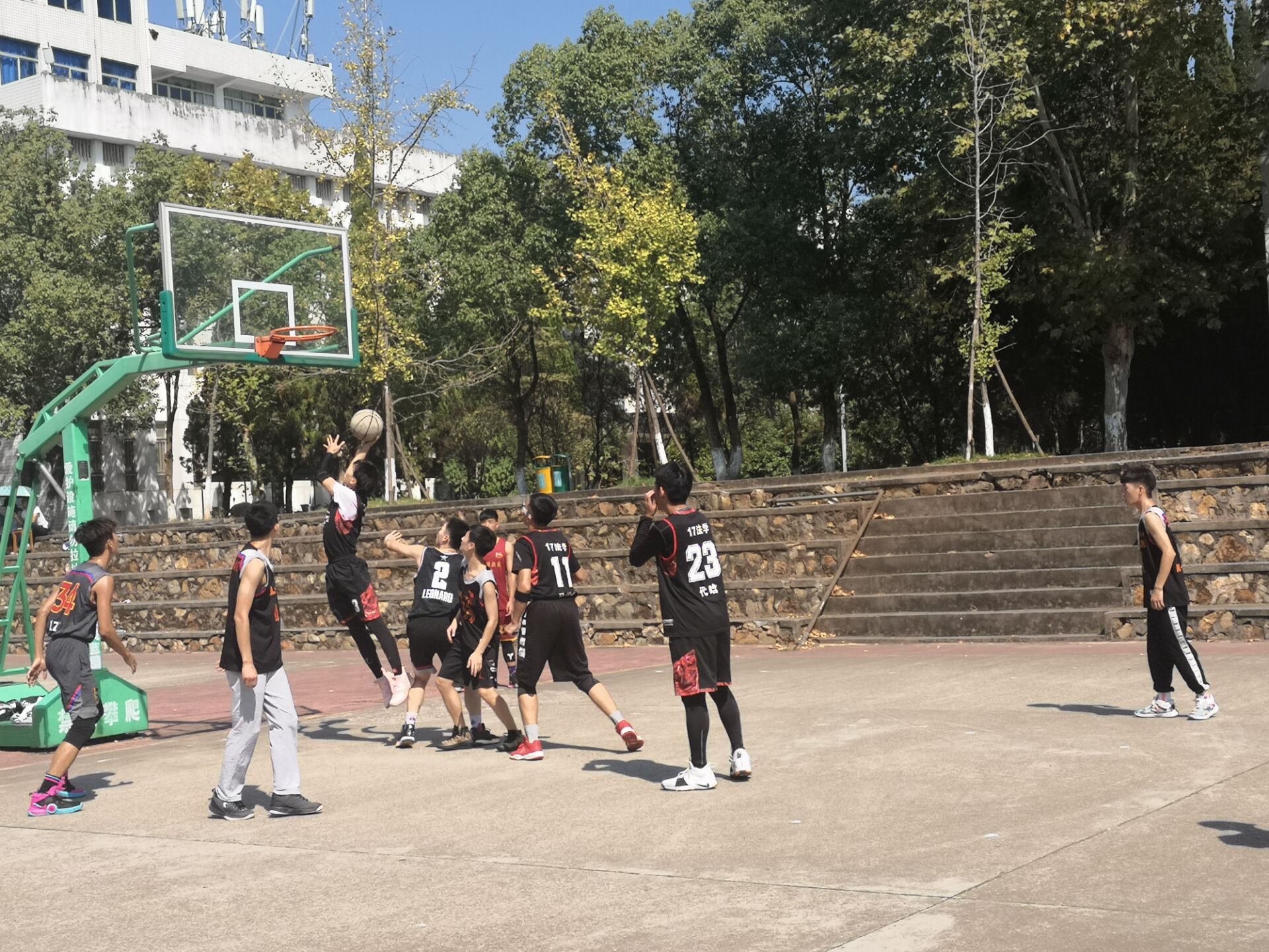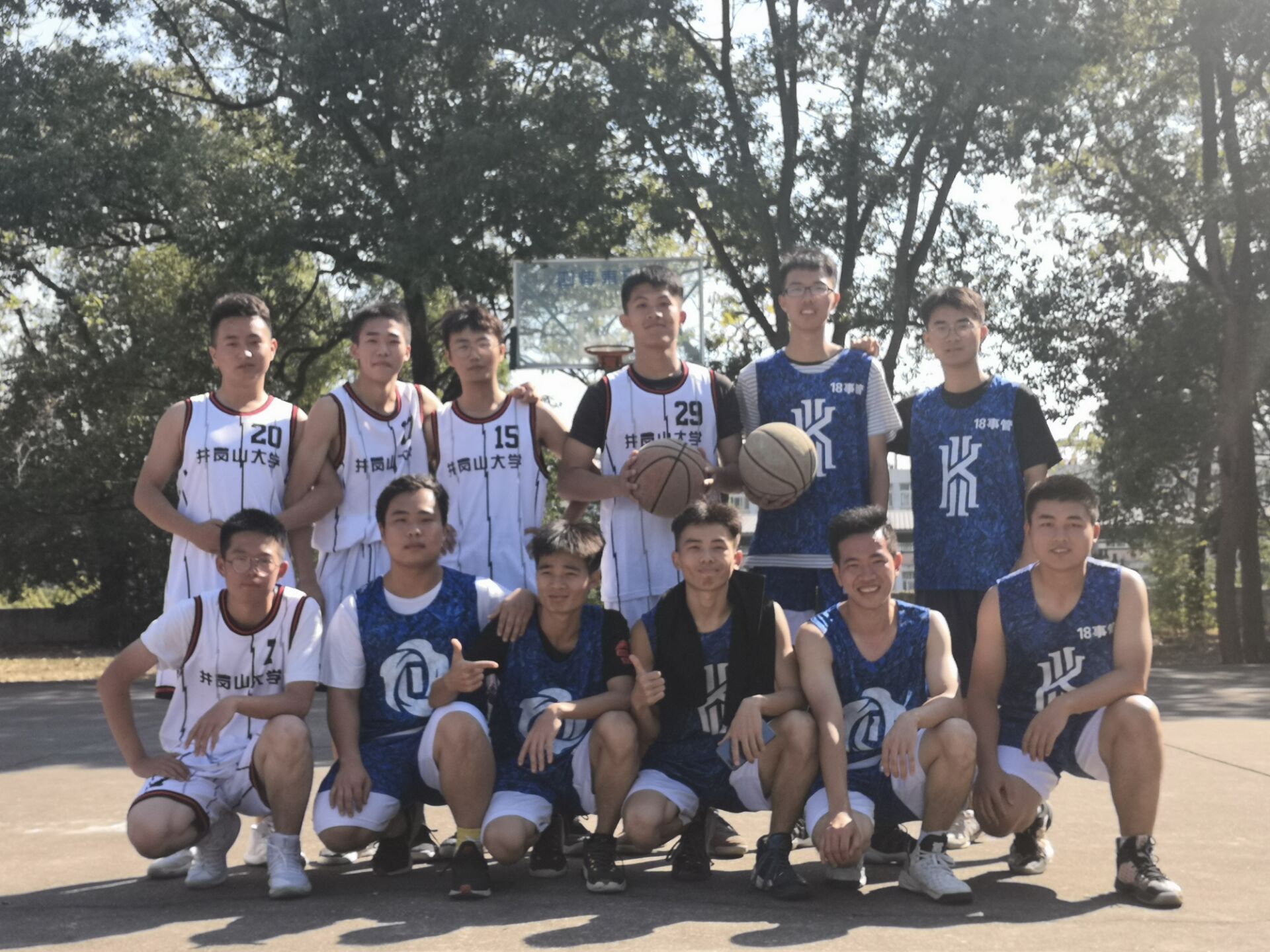比赛开始前二十分钟,球员来到篮球场,换好球服,做好准备活动。比赛开始,双方中锋争球,球员们摆开姿势,运用熟练的技术运球、抢球、防守、进攻,队员之间配合默契、通力合作,充分展示了球员之间的高度默契和良好的身体素质。最终获胜队伍为17红队、17事管、18法学、19政治。球员们赛后合影留念。