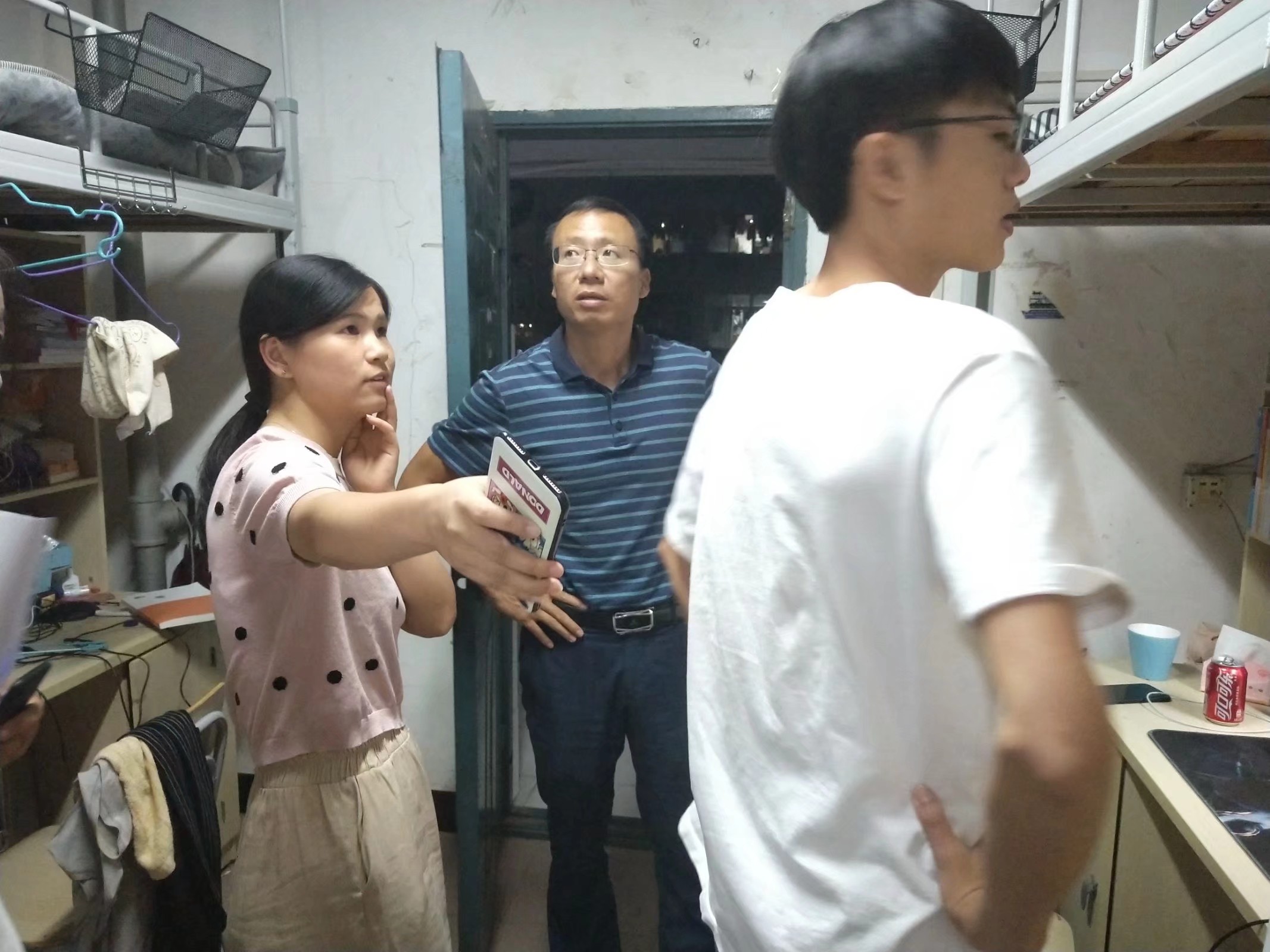 为切实做好国庆前后学生安全管理工作,确保学生人身财产安全,维护校园和谐稳定,9月27日晚6时30分,政法学院党委副书记吴高平,团委副书记、学生科副科长杨婷,辅导员康积勤、肖文海带领学生干部深入学生寝室开展了一次全面的安全隐患大排查,对我院每个学生寝室进行了仔细的排查。