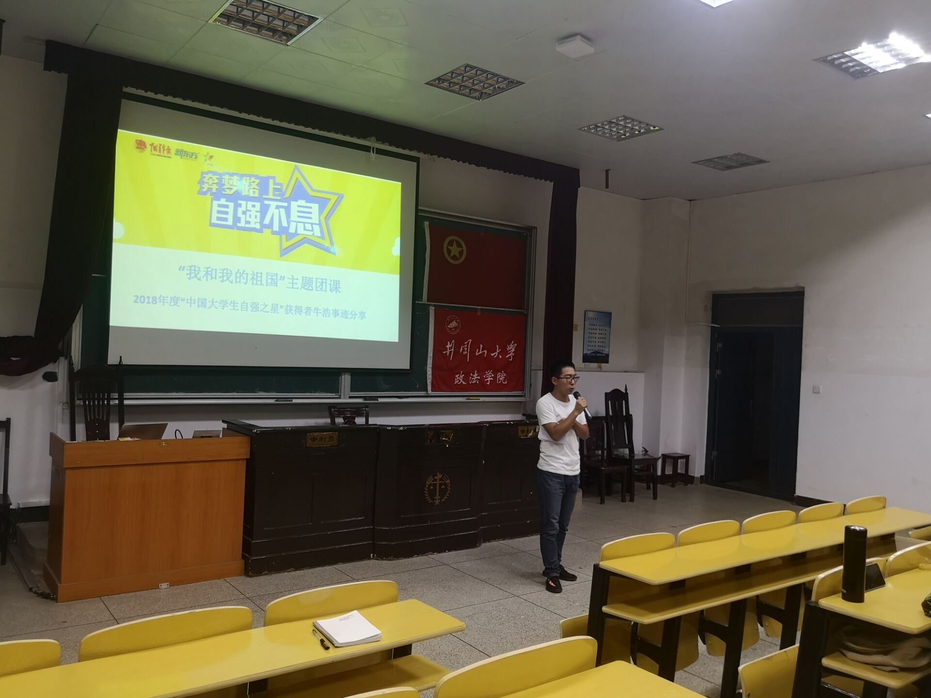 为深入学习贯彻习近平新时代中国特色社会主义思想,庆祝中华人民共和国成立70周年,激励广大团员青年大力弘扬以爱国主义为核心的民族精神。9月15日晚,政法学院团委组织部于五栋408开展“我和我的祖国”主题团课。本次团课由中国大学生自强之星牛浩同学担任主讲人,政法学院2019级全体团支部团员参加。