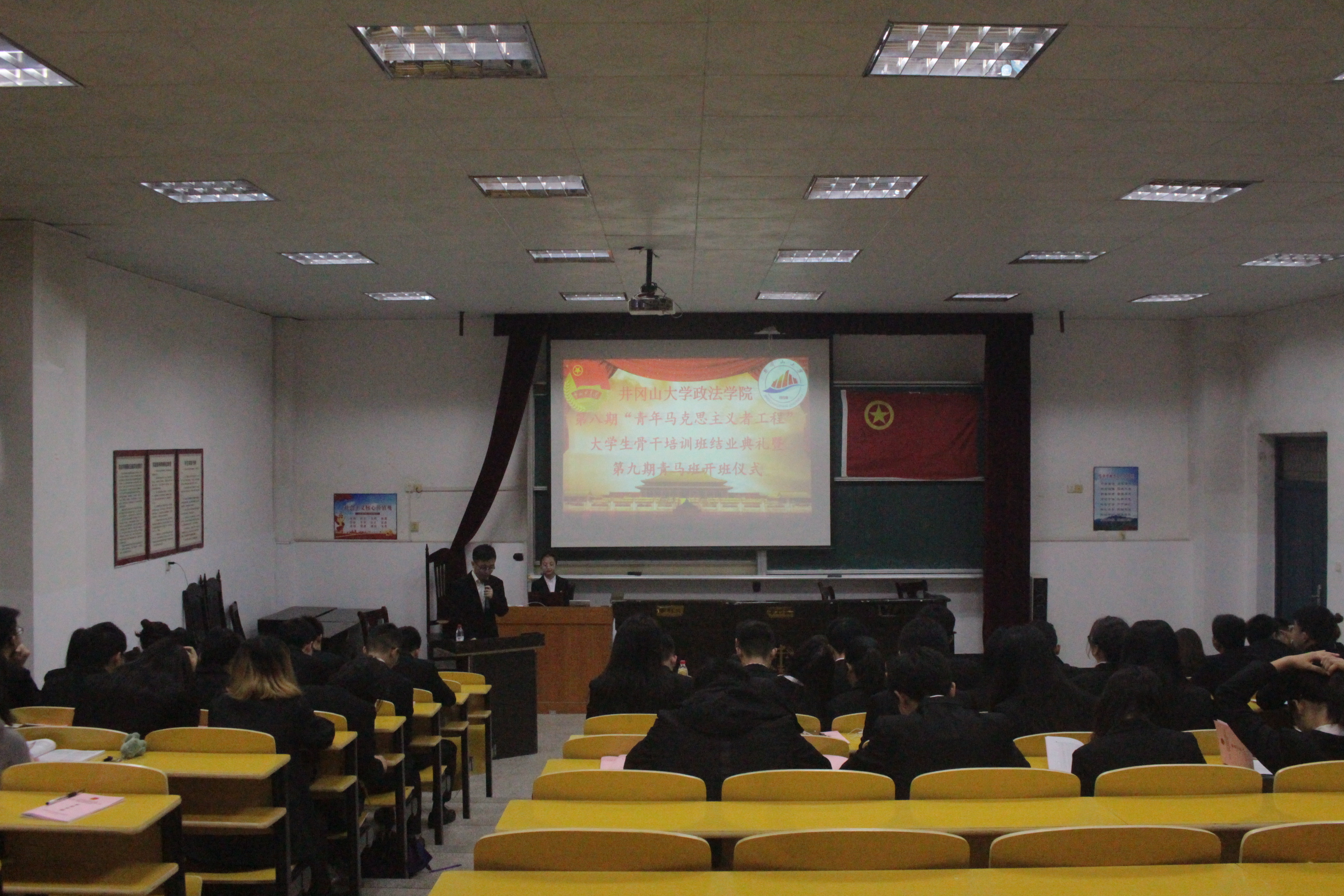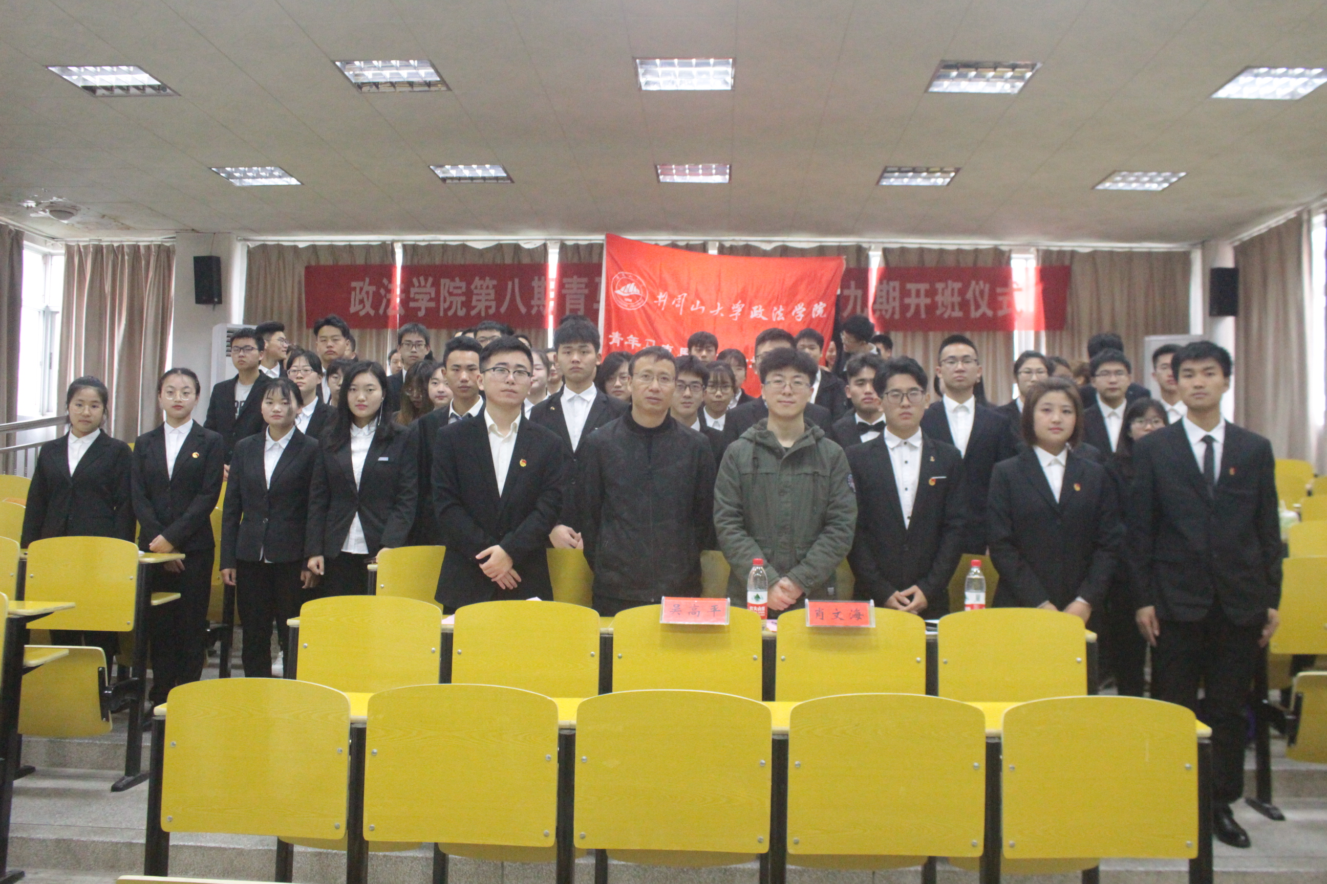 为不断提高大学生骨干、团学院干等青年群体的思想政治素质、政策理论水平、创新能力、实践能力和组织协调能力,3月23日上午8时30分,我院于5栋408室顺利举行第八期“青马班”结业典礼暨第九期青马班开班仪式。政法学院党委副书记吴高平,18级辅导员肖文海出席此次仪式。第十二届团委学生会部长级以上成员,第八期青马班优秀学员及第九期全体青马班学员到场参与。