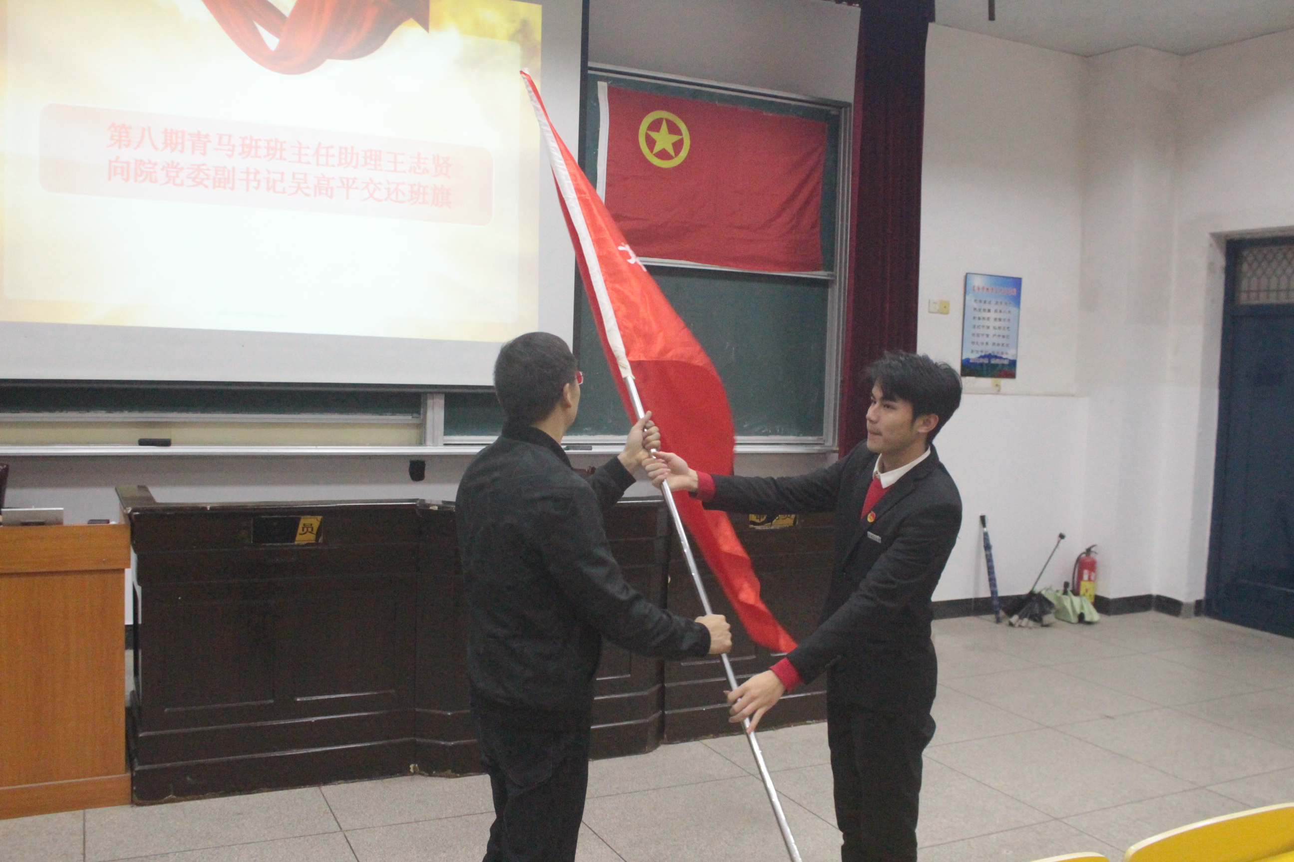 仪式伊始,全体成员奏唱《中国共青团团歌》。随后,肖文海宣布政法学院第八期青马班优秀学员名单,第八期优秀学员代表庞泽锐对自己在青马班的所学所感进行总结与分享,希望第九期学员们能在付出中收获,在收获中成长。而后,吴高平给第八期青马班优秀学员进行颁奖,第八期青马班班主任助理王志贤向吴高平交还班旗。接着,肖文海宣布《政法学院第九期“青年马克思主义者培养工程”大学生骨干培训班培训方案及人员名单》,并且进一步介绍了此次培训的主旨与流程等。宣读完毕,第九期青马班学员代表付文俊发言,说出了自身对于本次培训的独特见解以及奋斗目标。发言结束后,吴高平为第九期青马班成员授旗并致辞,对成员们寄予“积极进取、态度端正、学以致用”等厚望。仪式结束,全体成员合影留念。