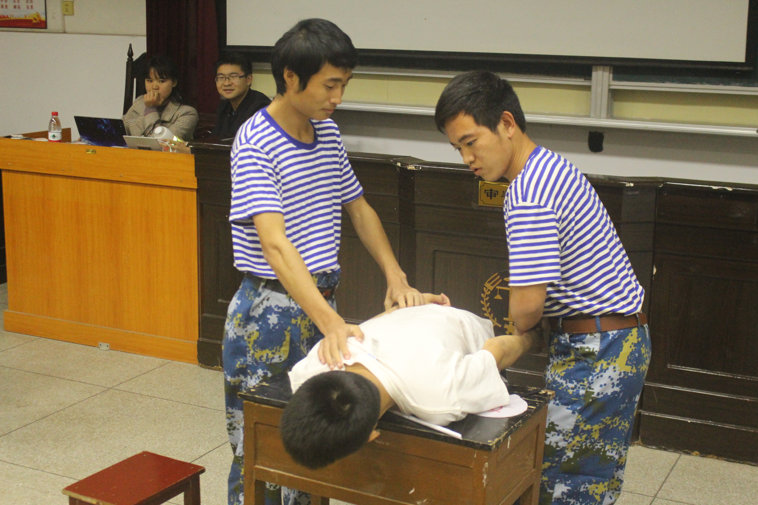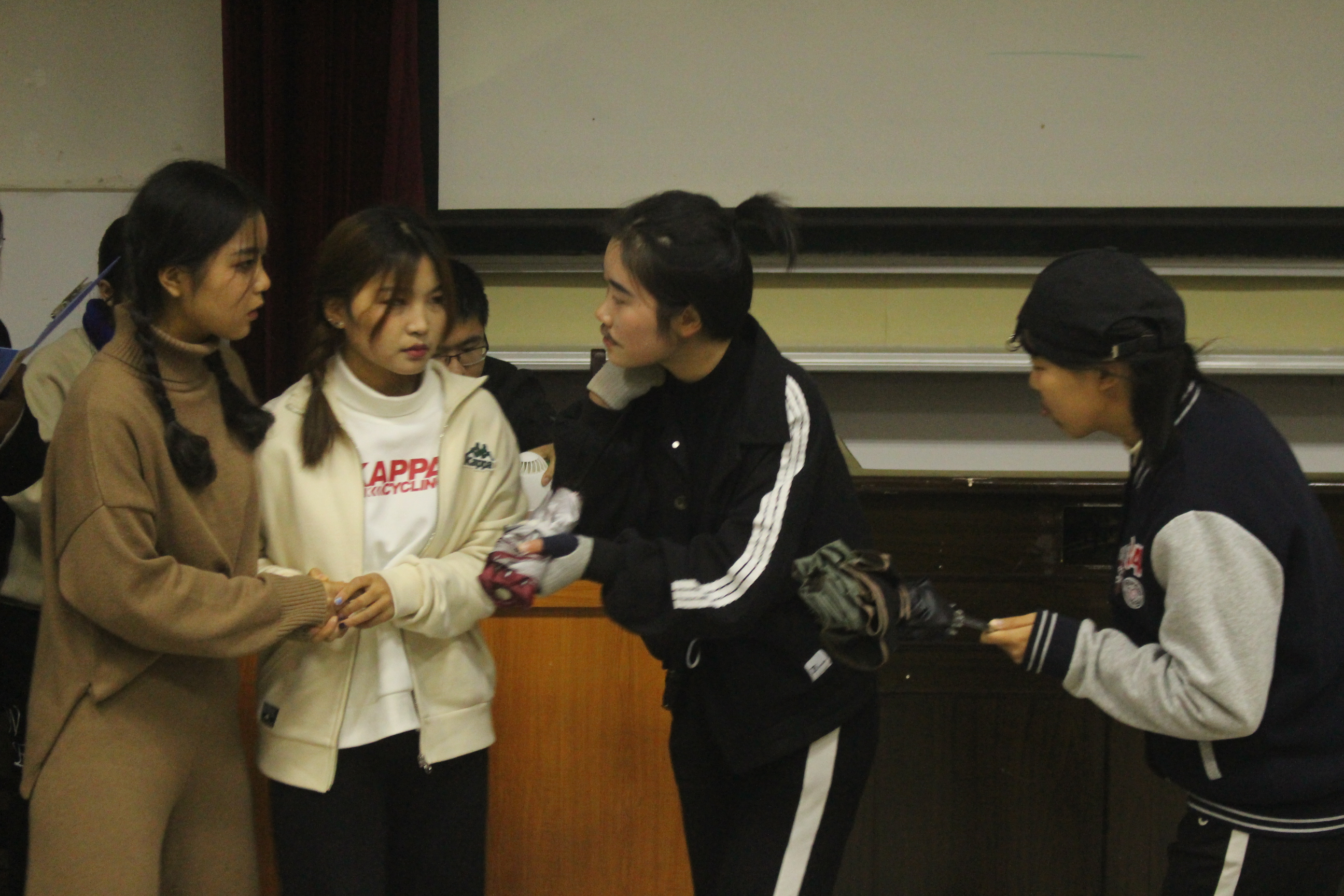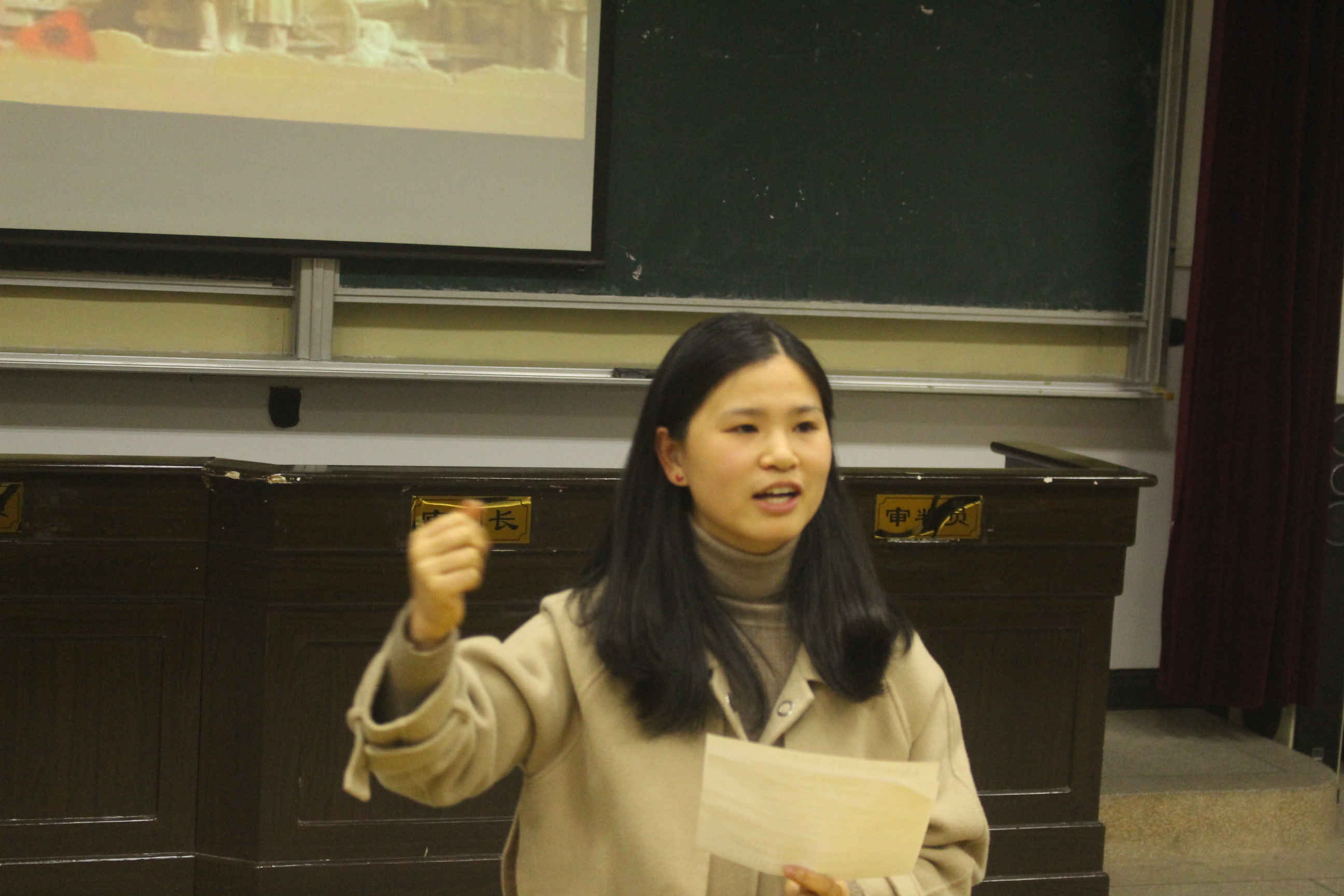 在主持人简单介绍后,红色故事会拉开帷幕。本次有6个队伍参与比赛,他们是法一班 《革命姐妹花》;政治班 《不朽的忠魂》;事管班《血衣的告白》;社工班《杀了邝澭 还有邝澭》;事管班《绽放的向日葵》;法二班《唱国际歌,抓奸细》。演员们准备充分,动作到位;旁白感情充沛,抑扬顿挫,伴随着一曲曲音乐响起,一幕幕PPT展开,全场掌声经久不衰!