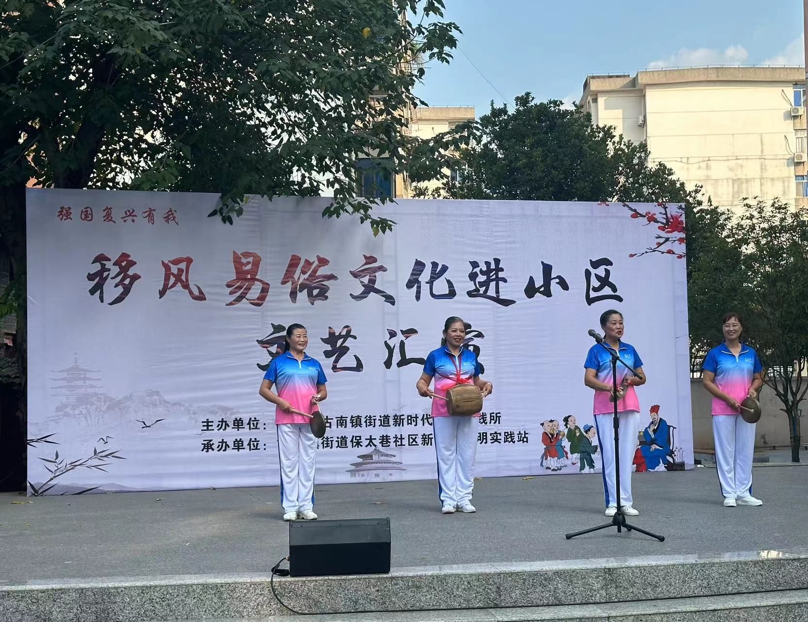 活动准备阶段,身披红色志愿马甲的志愿者们积极配合社区工作者布置场地,一同悬挂好活动横幅,摆放好活动所需桌椅等。活动进行时,志愿者们为前来参加活动的社区居民热情讲解移风易俗的相关内容,如拒绝高价彩礼、反对攀比之风等。随后,志愿者为居民发放主题宣传单,进行移风易俗宣传。汇演开始,表演者们热情洋溢,呈现他们精心准备的节目,用自己的实际行动支持移风易俗的开展,以幽默风趣的表演形式让移风易俗理念更深入人心,积极呼吁广大群众做移风易俗的倡导者、践行者。
