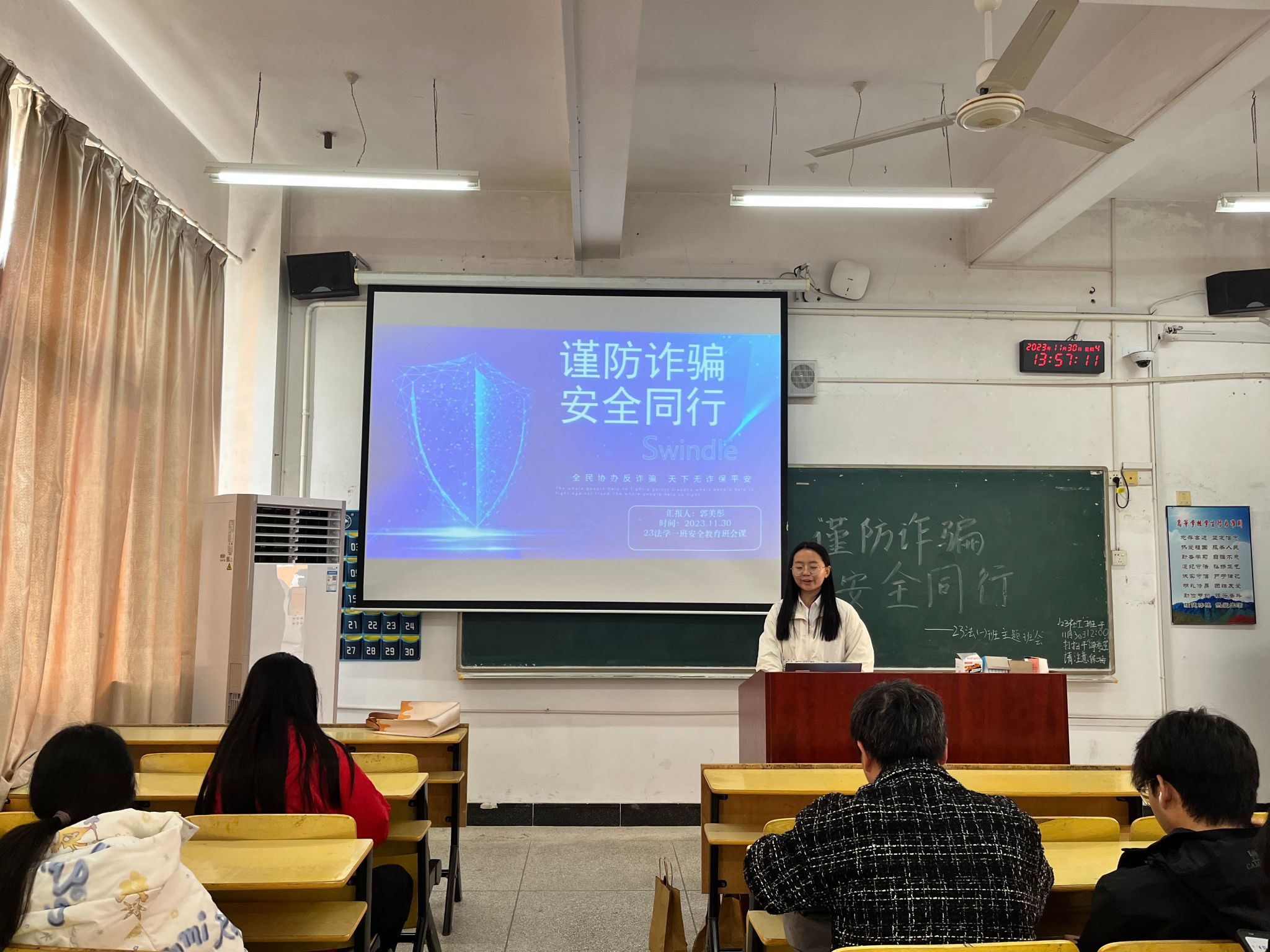 为提升学生的安全防范意识,提高学生的安全防范能力。11月30日下午2时,政法学院于5栋409教室开展安全教育主题特色班会,本次活动政法学院23级法学本一班学生参与。