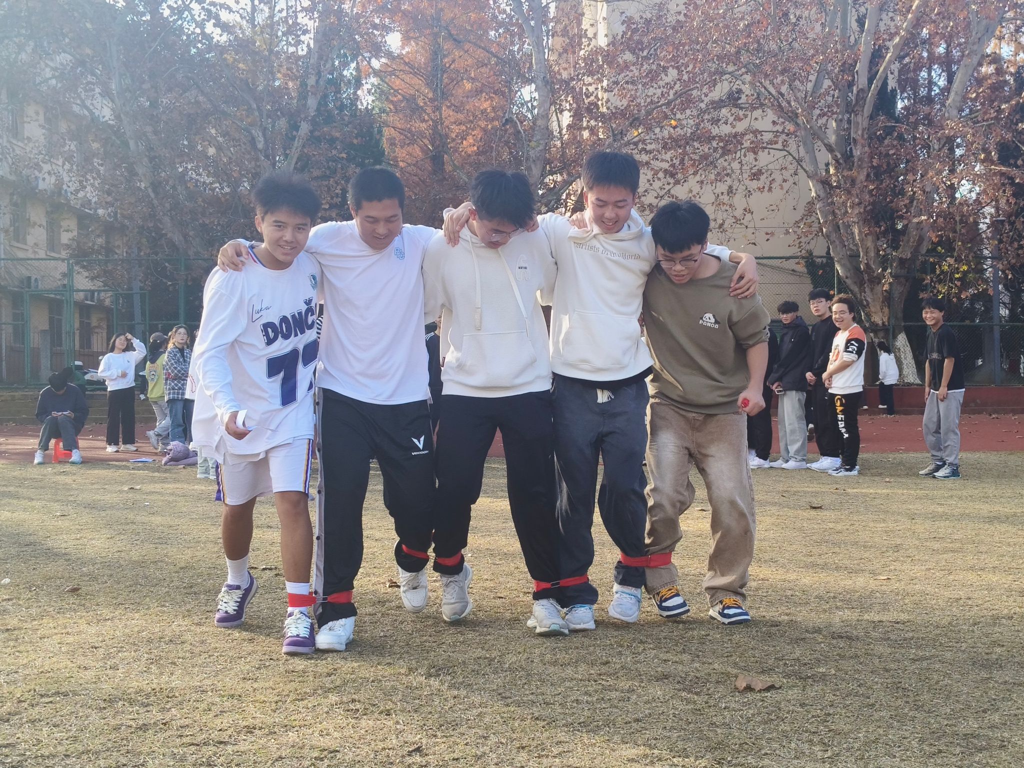 田径场上,运动会准时开始。比赛第一项旋转传声筒接力赛以班级为单位展开,同学们团结合作、共同配合,在接力旋转缠绕布带中传递法律基础知识。现场气氛火热,加油声、欢笑声此起彼伏,紧接着开始了筷子夹乒乓球项目,同学们在跑道起点处认真思考,根据工作人员依次给出的五个短句在乒乓球中找出相应的法律名词,并用筷子夹起,往返运行。在一轮轮紧张的比赛后,来到了五人六足比赛项目,跑道上五人并肩站立,努力协调步伐向前进,将写有法律条文的便签正确投放至写有对应法律名称的盒子当中。随着太阳西斜,运动会也迎来最后一个项目——法律常识知多少。每场比赛中,八名选手相互配合完成跳绳任务,并回答关于法律常识的问题。活动最后,全体人员合影留念,至此,这场别开生面的法治趣味运动会圆满结束。