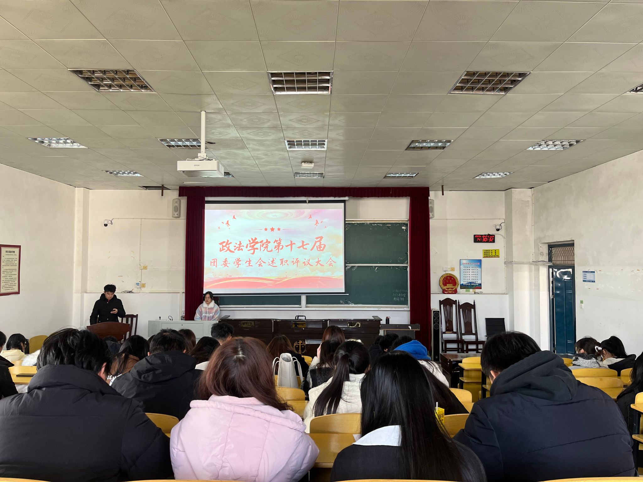 为推进政法学院学生工作顺利进行,保障工作质量,政法学院于12月21日下午2时30分在5栋408教室举行第十七届大自委团委学生会述职评议大会。政法学院党委副书记喻聪,团委副书记、学生科副科长肖文海,辅导员欧阳蓓,葛以璇出席,政法学院第十七届大自委团委学生会全体学生骨干与会。