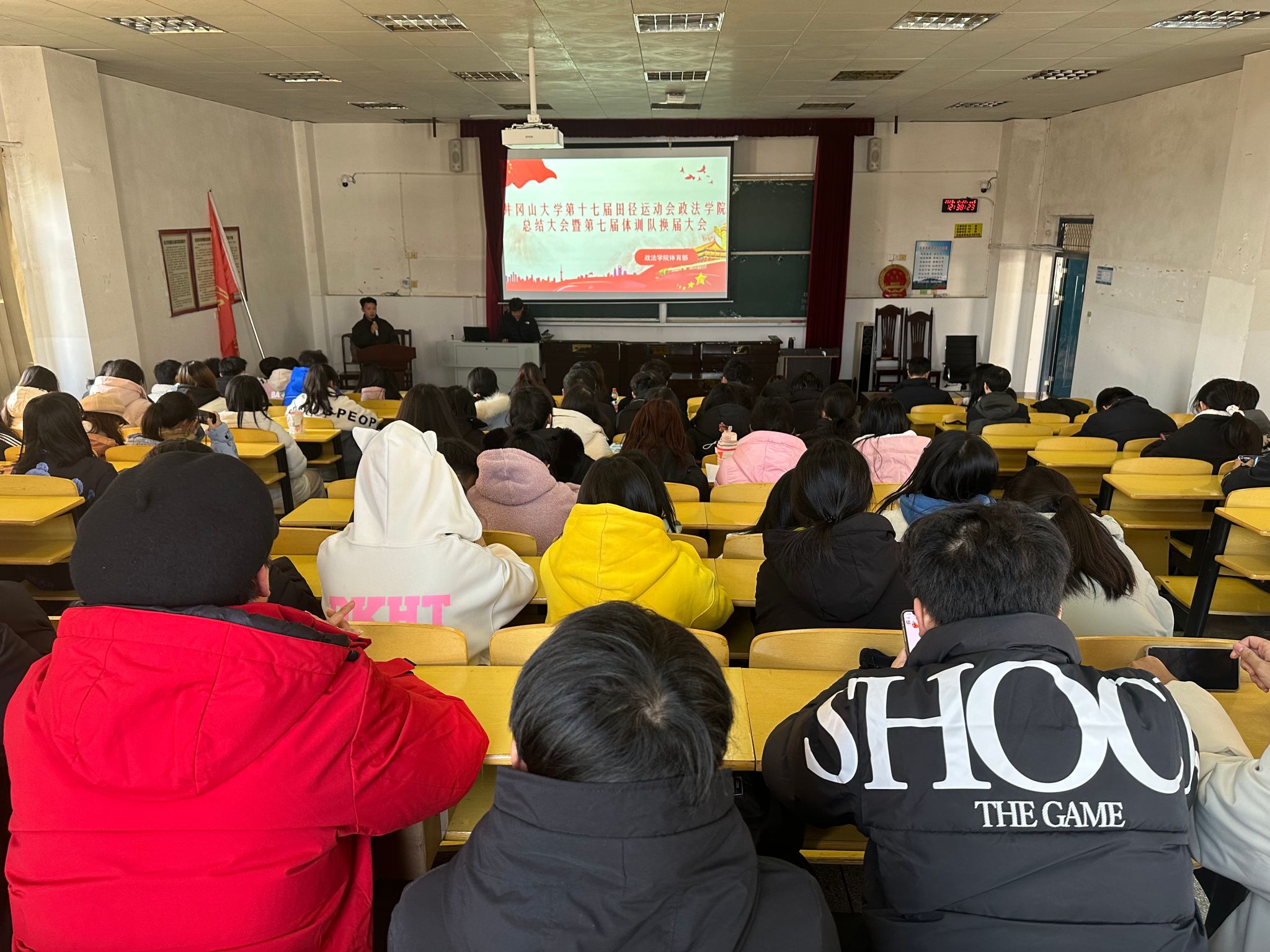 为总结第十七届政法学院运动会的经验、发掘政法学院在体育运动方面的人才。12月22日中午12时30分,政法学院校运会总结大会暨体训队换届大会在5栋408室顺利举行。政法学院团委副书记、学生科副科长肖文海和政法学院辅导员葛以璇出席本次大会,学院第十七届大自委团委学生会全体成员、政法学院全体运动员、体训队全体成员参加。