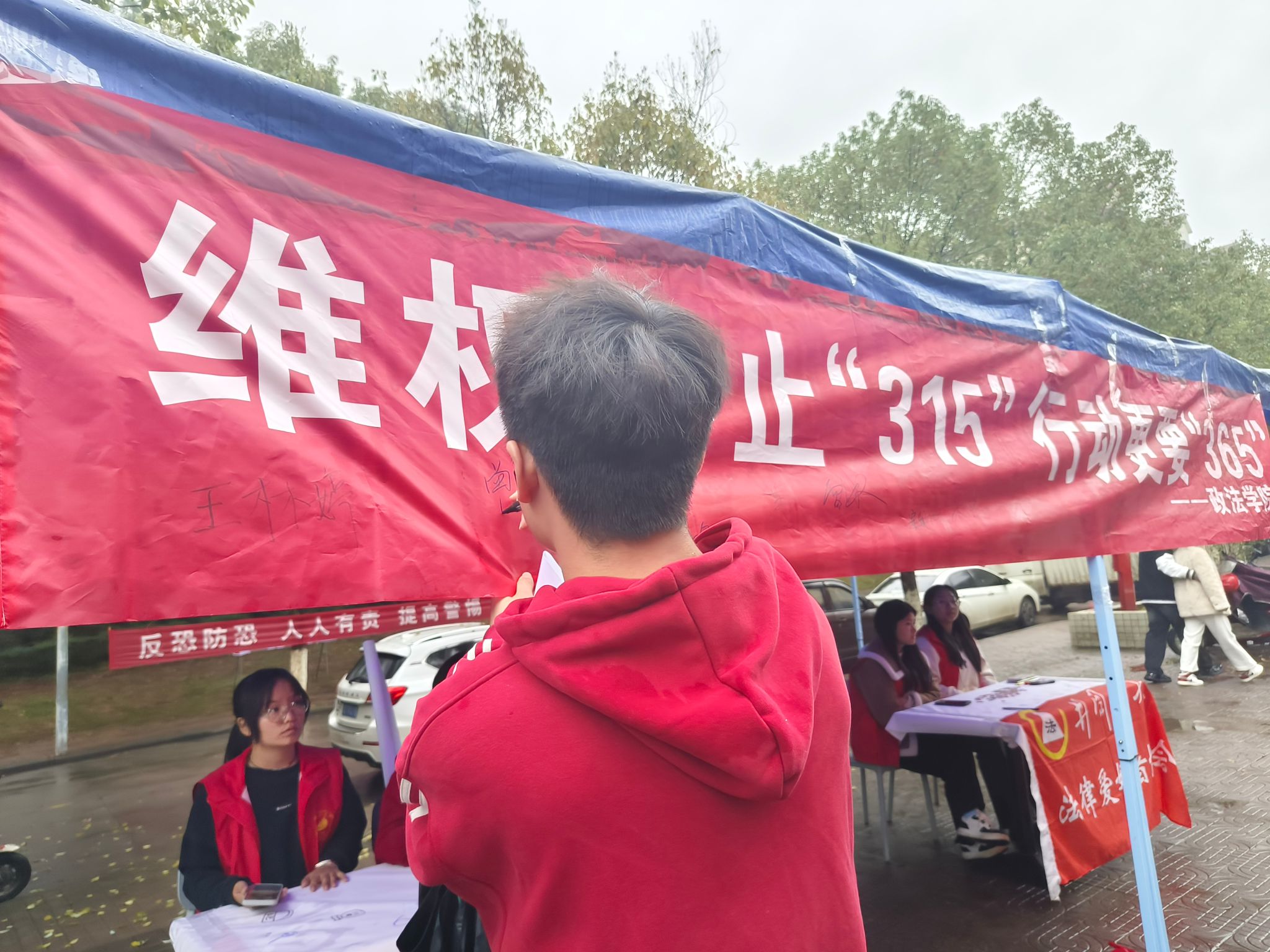 为切实增强大学生消费群体的权益保护意识,创造和谐的消费环境,3月15日上午11时,政法学院学生会学生权益服务部和社会实践部(爱心社)联合法律爱好者协会,在南区一食堂门口开展“维权不止315,行动更要365”消费维权活动,引导同学们积极学习维权知识。