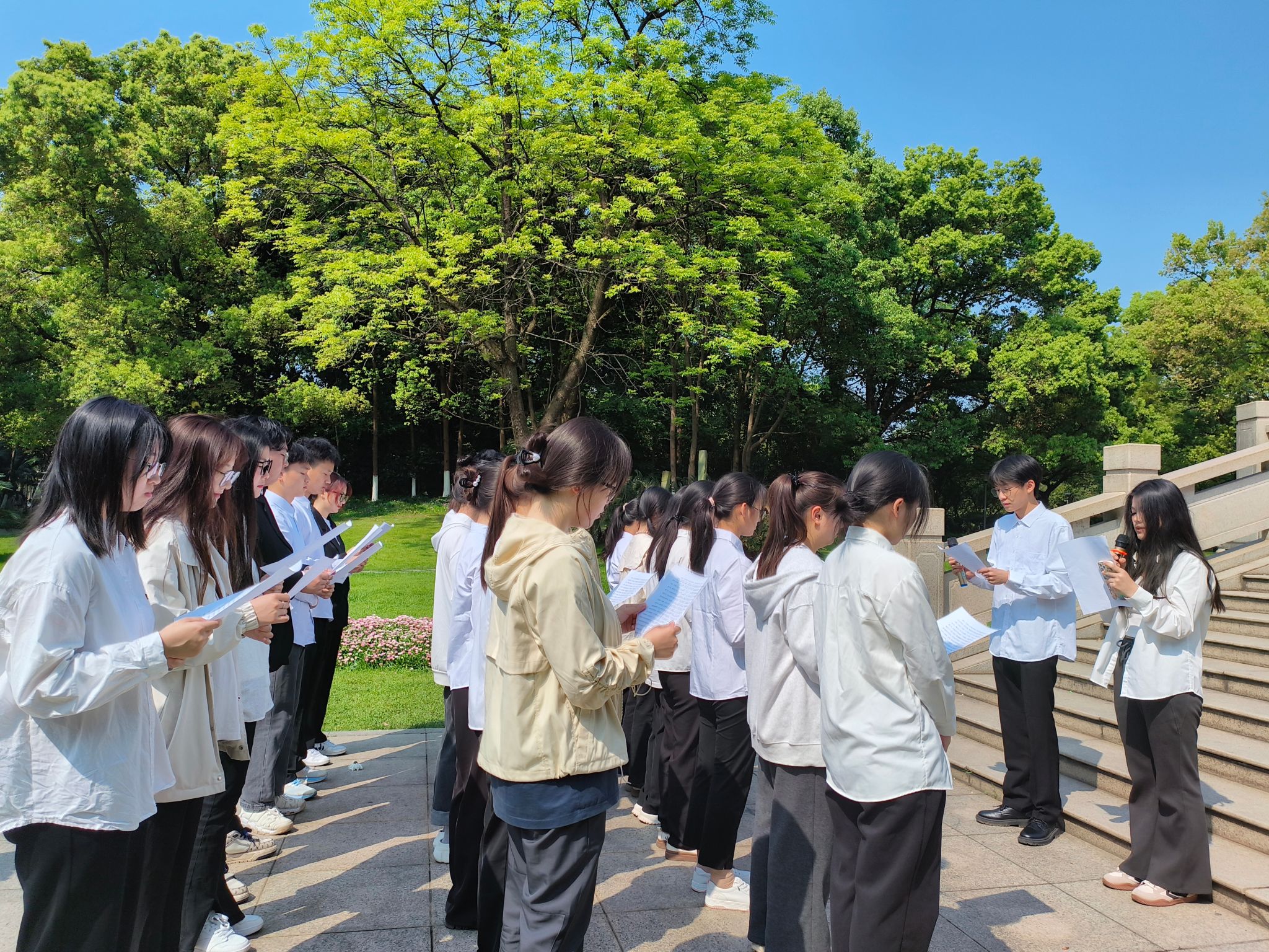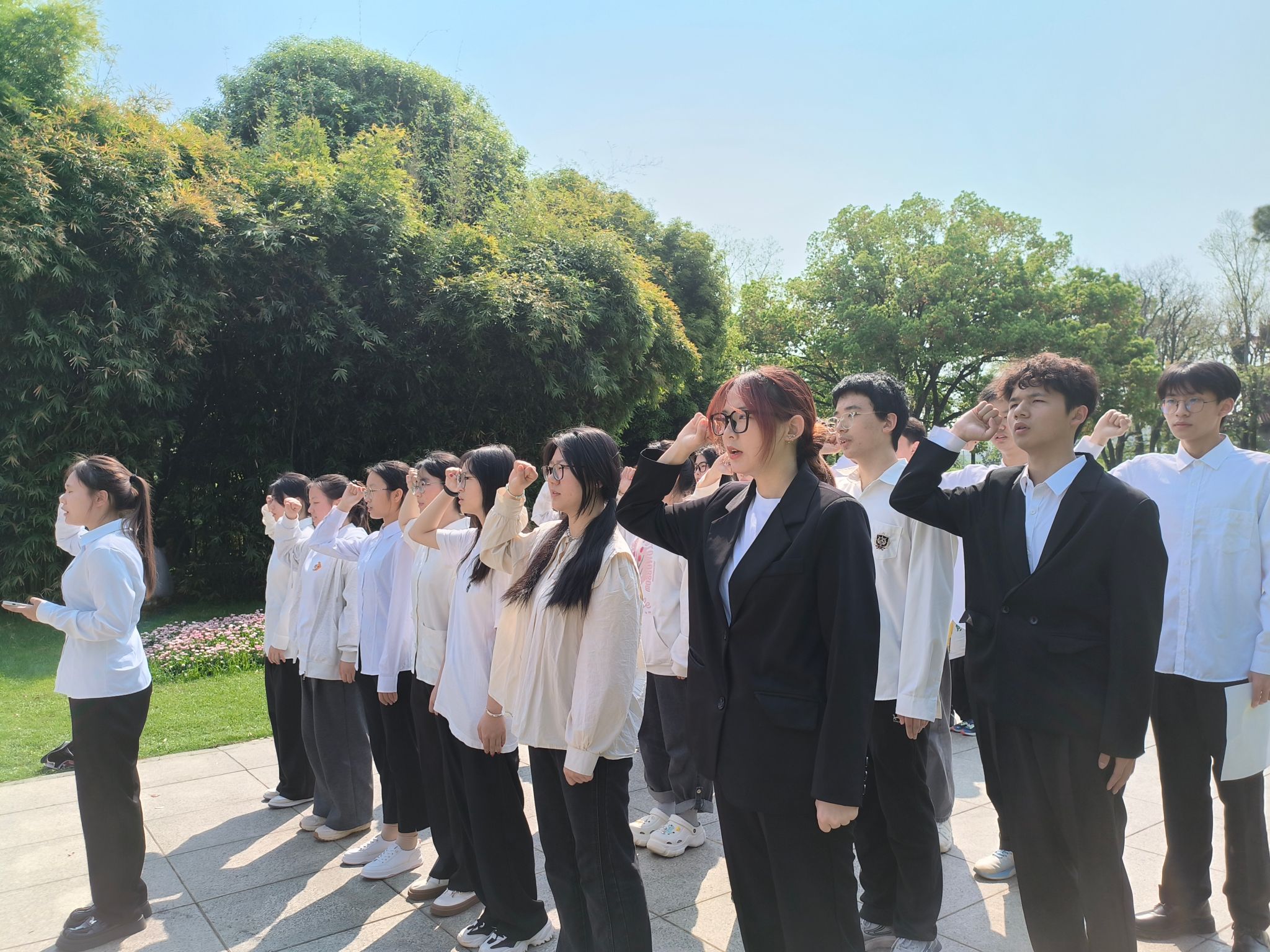 烈士纪念碑前,全体同学整齐列队,在庄严肃穆的氛围中奏唱国歌,激昂的旋律如同革命先烈的精神,在空中久久回荡。接着全场默哀三分钟,同学们怀着沉重的心情,深切缅怀那些为国家、为人民牺牲的英勇先烈。默哀结束后,同学们依次向前在纪念碑下献上鲜花并鞠躬,表达了对革命先烈的敬仰与追思。随后,许艺馨带领大家重温入团誓词,冯浩宇、张妍领读方志敏烈士的《可爱的中国》(节选),字句铿锵有力、感情真挚,展现了同学们继承先烈遗志、不忘初心、牢记使命的坚定信念。最后,全体人员合影留念,活动圆满结束。