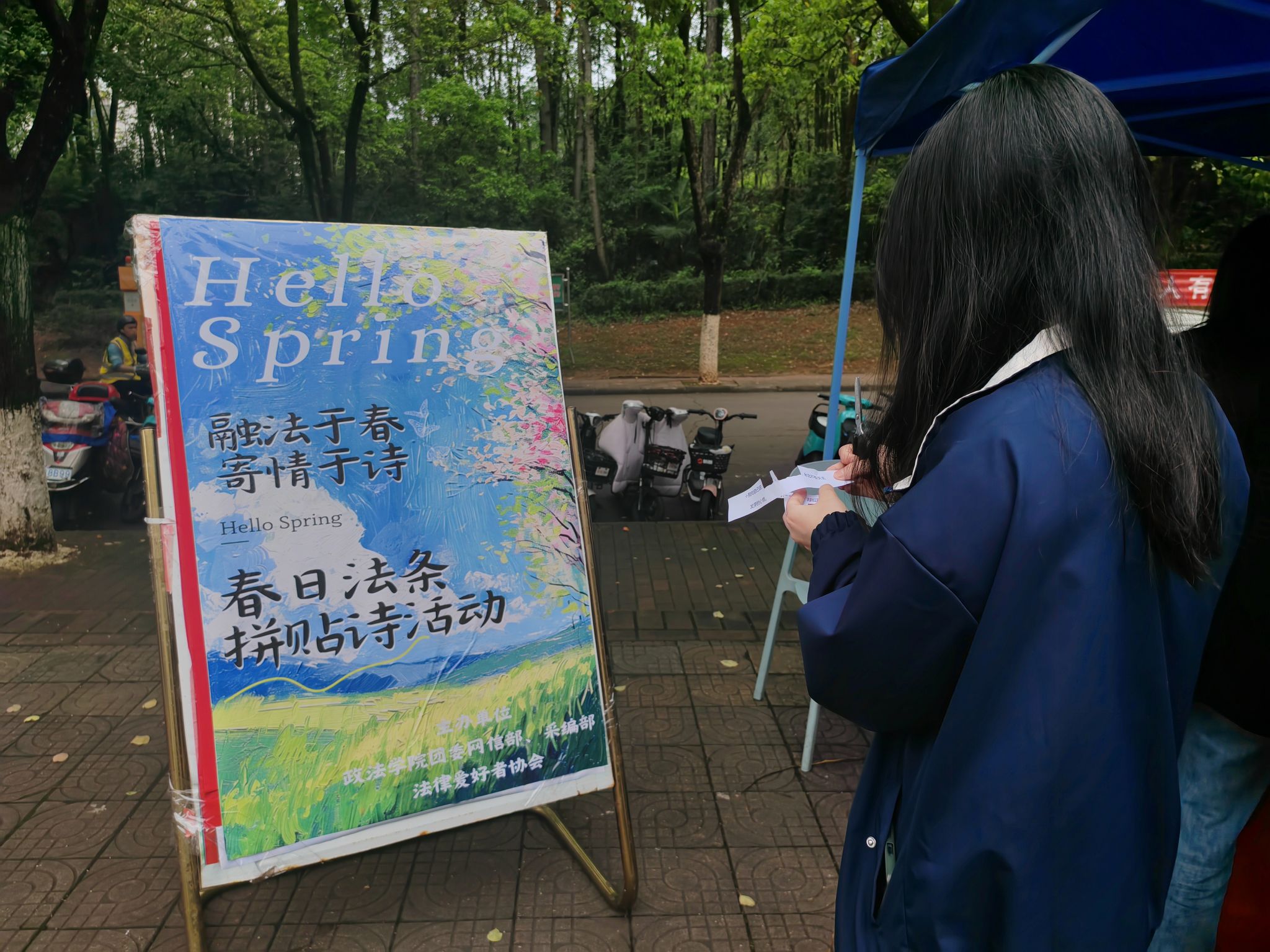 为通过创新的方式,将法律知识与春日的美景相结合,让同学们在欣赏春色的同时,感受法条中的韵律与智慧。政法学院团委采编部与网信部联合举办的“融法于春,寄情于诗”春日法条拼贴诗活动于2024年4月13日中午11时在南区一食堂门口火热展开。
