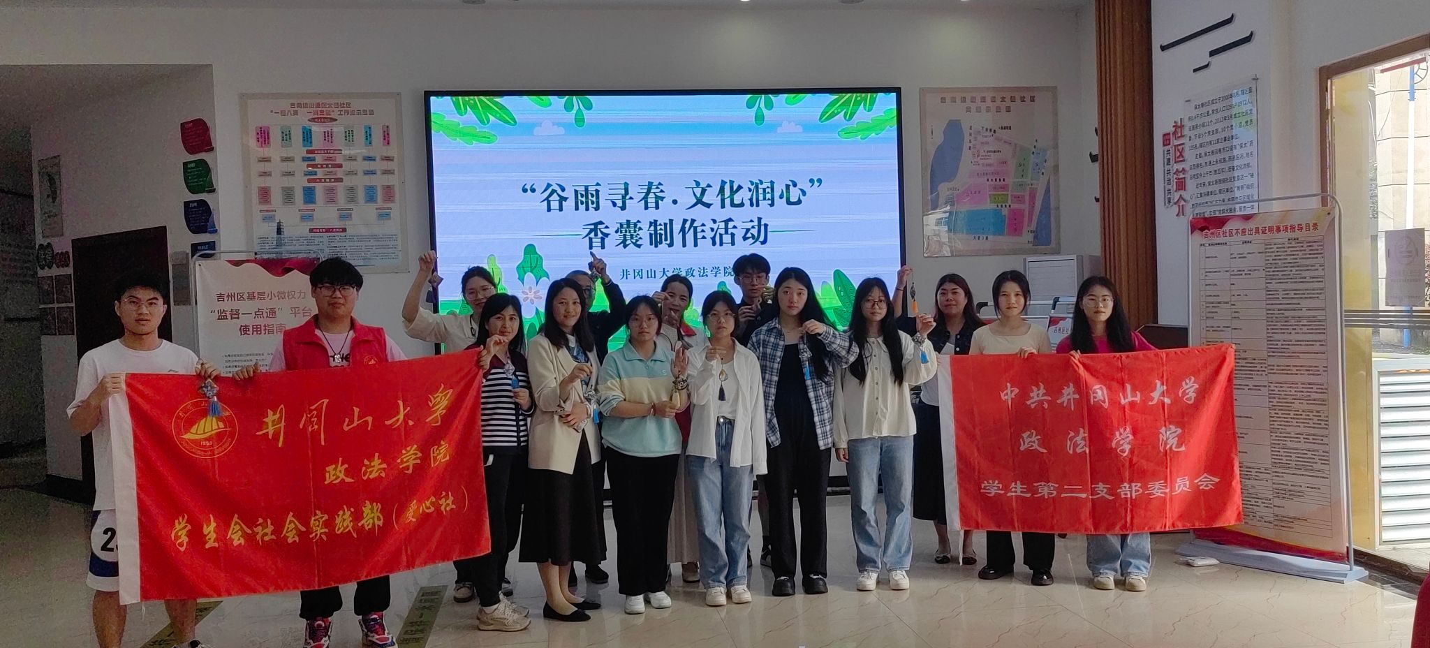 为进一步推广中华优秀传统文化,培养大家细心、坚持不懈的精神品质,融教于乐,4月24日上午9时,政法学院于吉州区古南镇街道保太巷社区开展了“谷雨寻春,文化润心”香囊制作活动。政法学院学生会社会实践部成员及部分社区居民参与本次活动。
