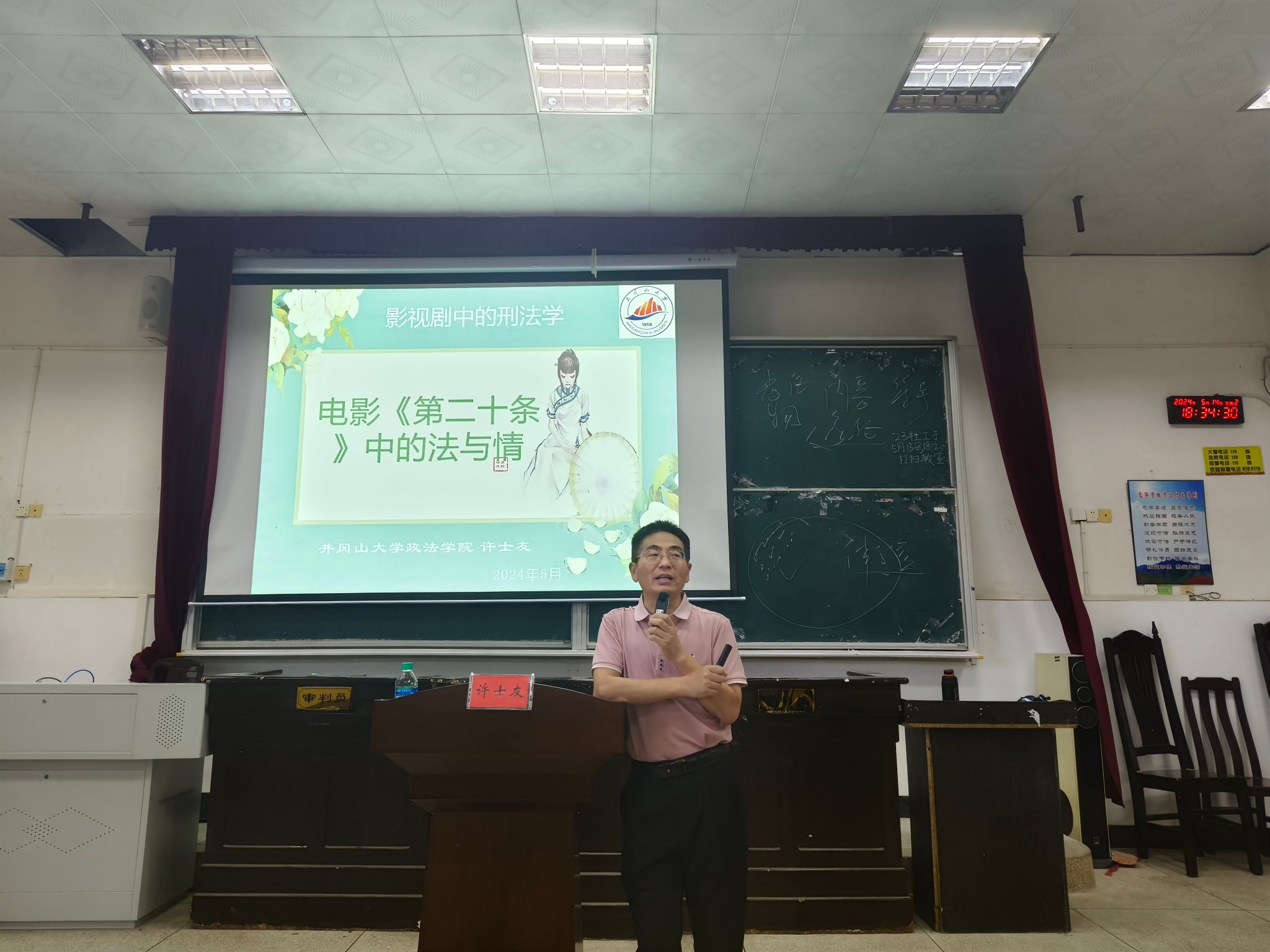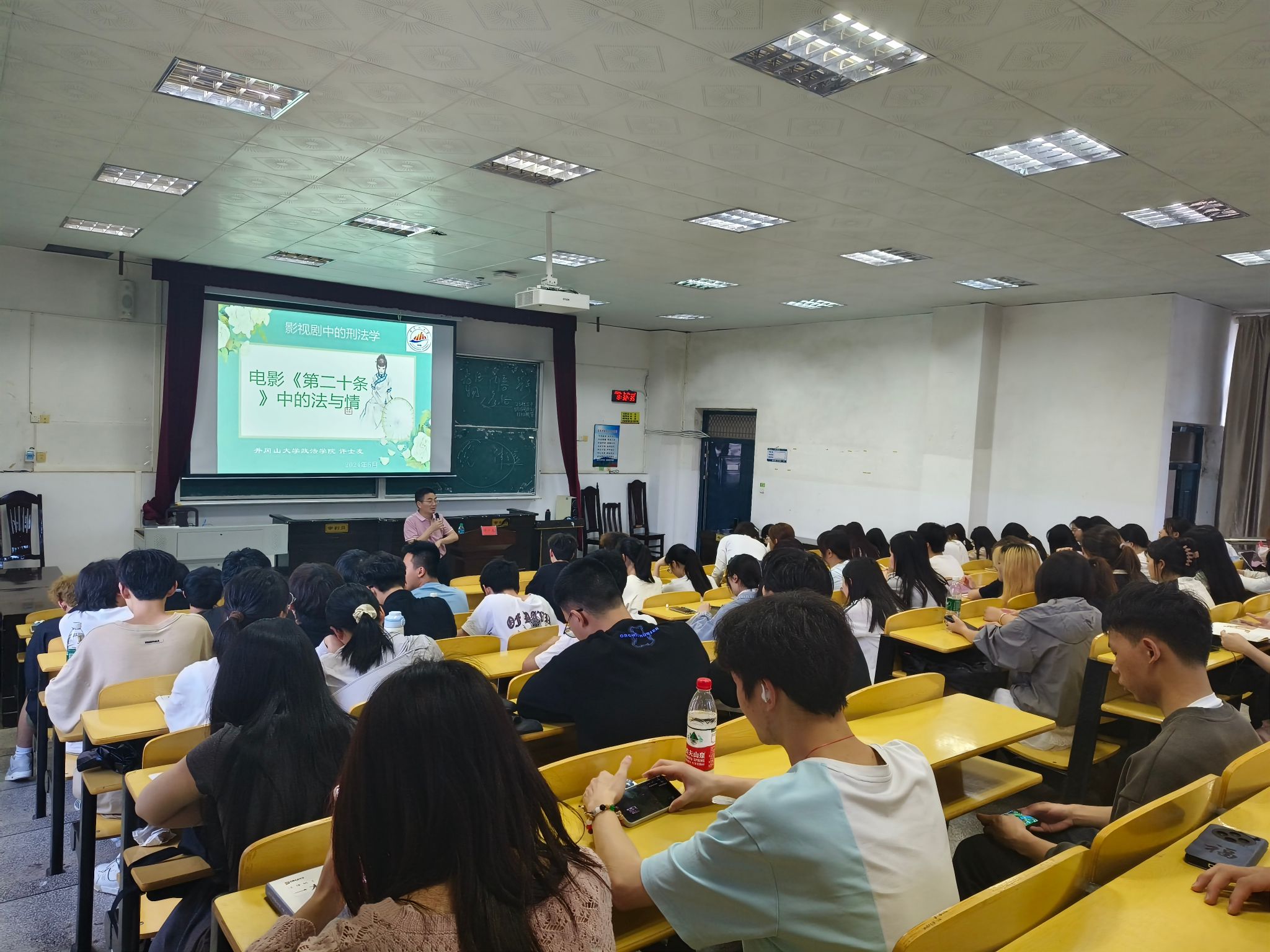 为加大校园法治教育宣传力度,提升大学生法治意识和素养,营造人人学法、守法、用法的良好环境,5月14日晚6时30分,政法学院于五栋教学楼408教室举行“影视剧中的刑法学”主题讲座,由许士友老师主讲。同学们都积极参与本次讲座。