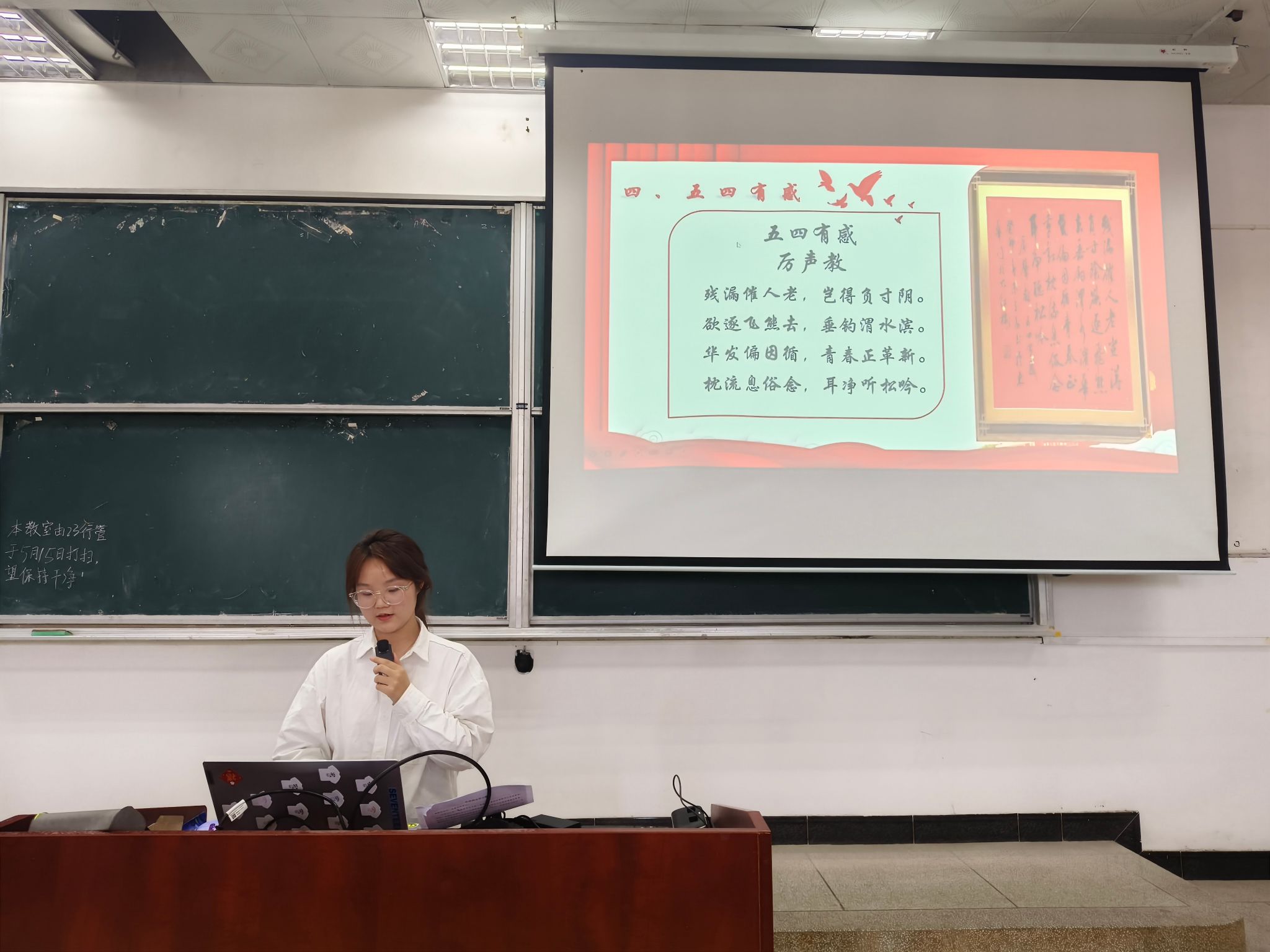本次例会中,陈曼首先给大家播放了一段视频,视频回顾了五四时期那些令人热血沸腾的场面。其后,陈曼围绕五四精神,从五四青年节、五四精神的具体内容和内涵、五四精神的现代内涵以及当代中国青年如何有为等方面,对习近平总书记五四重要寄语精神进行了深入阐释。随后,陈曼从三个方面凝炼了新时代青年如何有为:一、希望同学们能够在各领域、各方面勇当排头兵、生力军;二、希望同学们争做有理想、敢担当、能吃苦、肯奋斗的新时代好青年;三、希望同学们能够以实际行动展现青春作为,彰显青春风采,贡献青春力量。最后以习近平总书记对新时代青年的殷切嘱托为本次例会画上了圆满的句号。