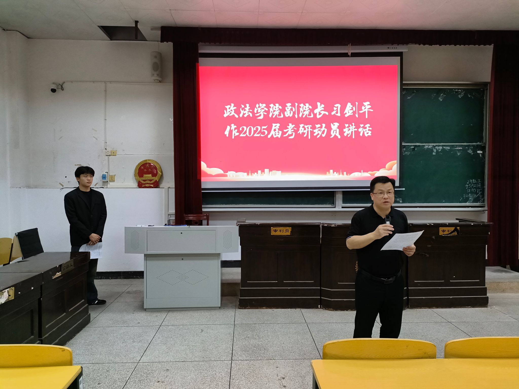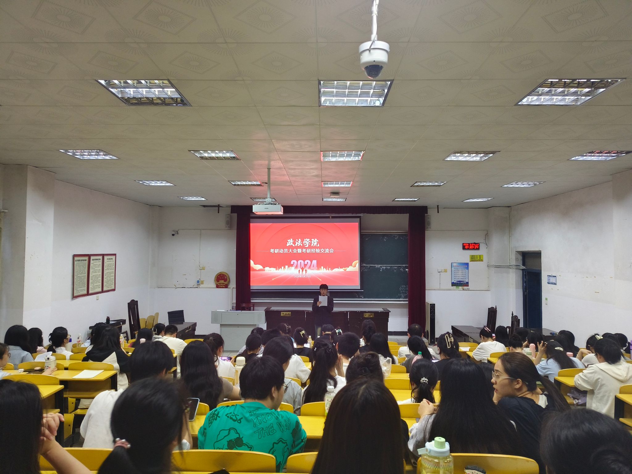 踔厉奋发,共向未来。为鼓舞考研学生斗志,激发同学们的考研热情,明确考研目标和方向,增强考研信心,5月21日晚6时30分,政法学院团委就业服务部于五栋408教室开展政法学院考研动员大会暨考研经验交流会。学院副院长习剑平,团委书记、学生科科长杨婷出席本次会议。同时学院特邀考研优秀学生代表来到现场为大家提供备考指导和经验分享,并为大家答疑解惑。