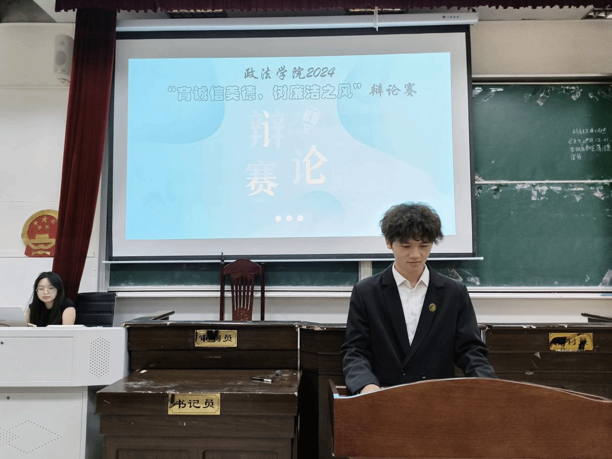为深入推进校园廉洁文化建设,增强学生的诚信意识和廉洁观念,培养学生的逻辑思维能力和语言表达能力,6月11日晚6时30分,政法学院于5栋408教室举行了“育诚信美德,树廉洁之风”主题辩论赛决赛。本次辩论赛由建筑工程学院张志、人文学院廖福娣以及政法学院朱婉玲担任评委。