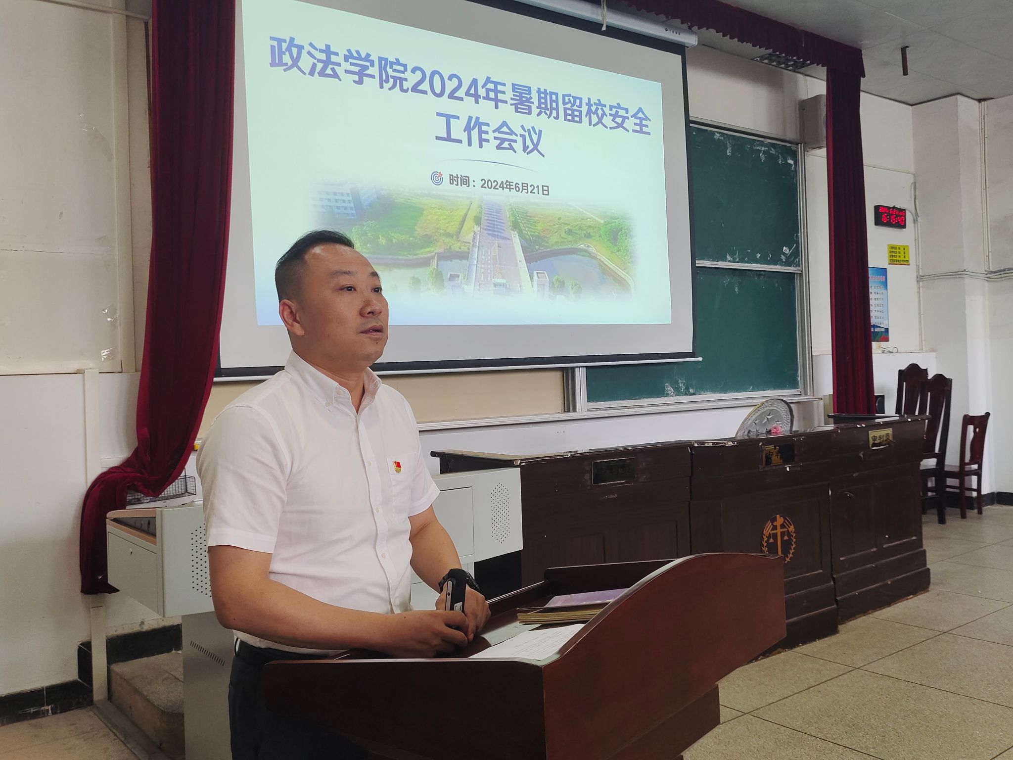 为进一步落实暑期留校学生各项管理工作,筑牢学生的安全屏障,6月21日下午16:00,政法学院于五栋408教室开展2024年暑假留校安全工作暨“三考”再动员会议。政法学院党委副书记喻聪,团委学生科全体老师出席,2024年暑假政法学院全体留校学生参加会议。
