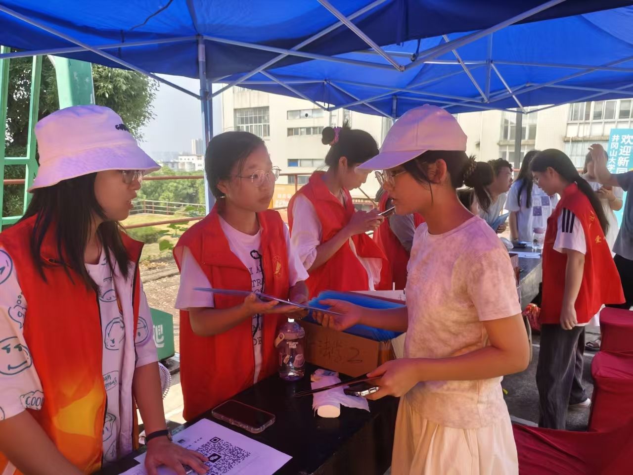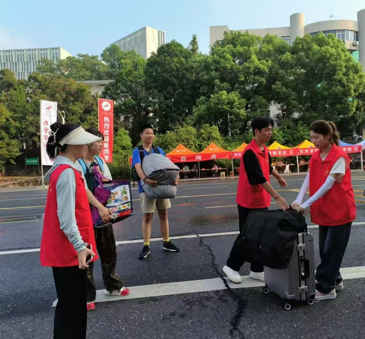 迎新现场,各项工作如火如荼,现场人头攒动,但秩序井然。艳阳高照下,西门迎新点处的志愿者热情地接过新生的行李,并带领其前往19栋报到点办理相关入学手续。报到点处的工作人员也有条不紊地收集好新生的各项入学必备物品,为其发放一卡通、宿舍钥匙及银行卡等物品,同时耐心细致地解决新生在报到过程中遇到的困难和问题。随后,在志愿者的引导下,新生有序办理一卡通、书本费缴纳、银行卡激活、空调租赁等程序,并顺利入住宿舍。此外,新生报到期间,学院领导高度重视迎新工作,多次深入迎新一线,慰问工作在一线的志愿者和工作人员,与前来报到的新生及家长交谈,带领其参观学院2024年三考展板,勉励初入校园的新同学尽快融入大学、努力成长成才。