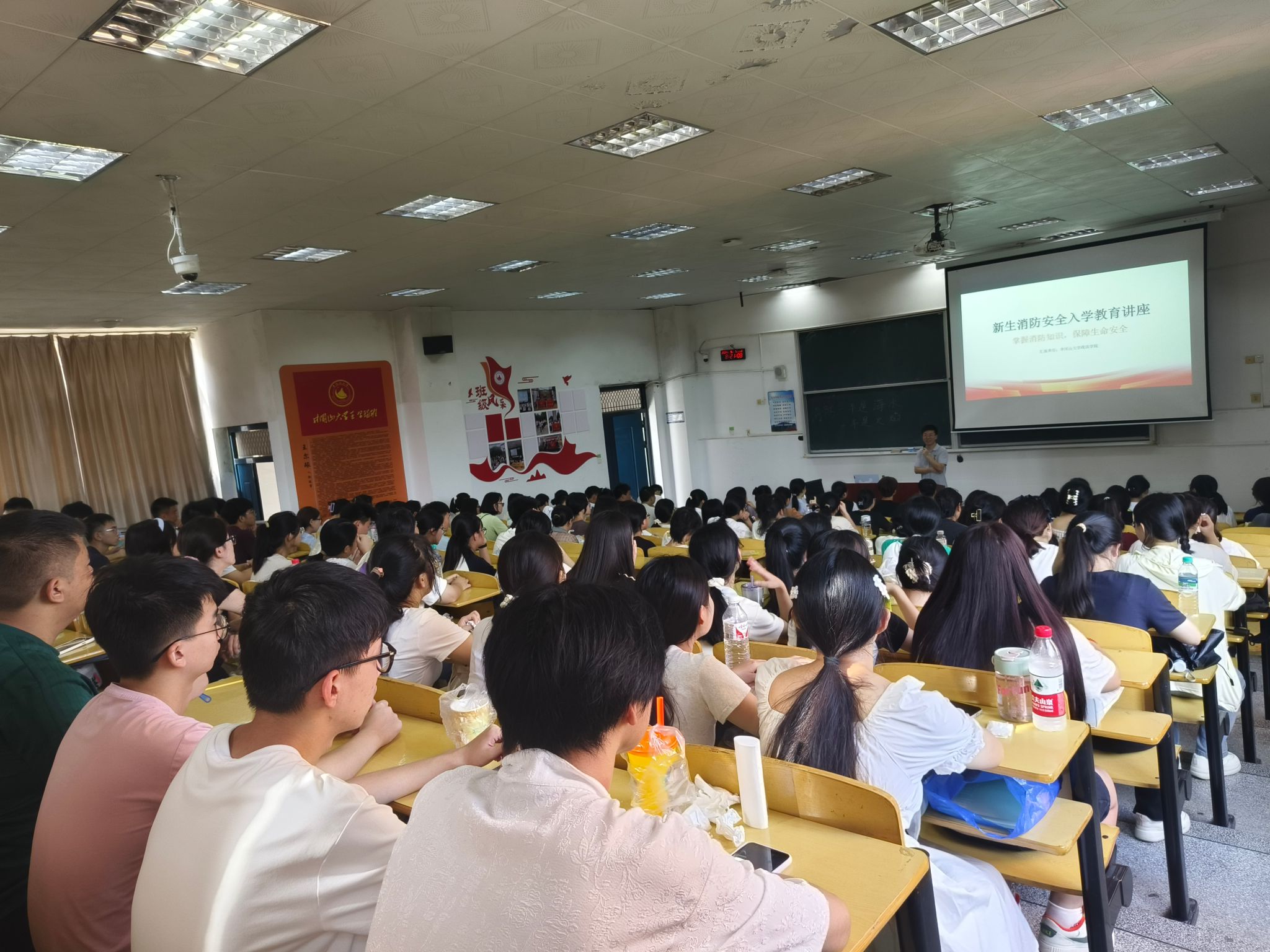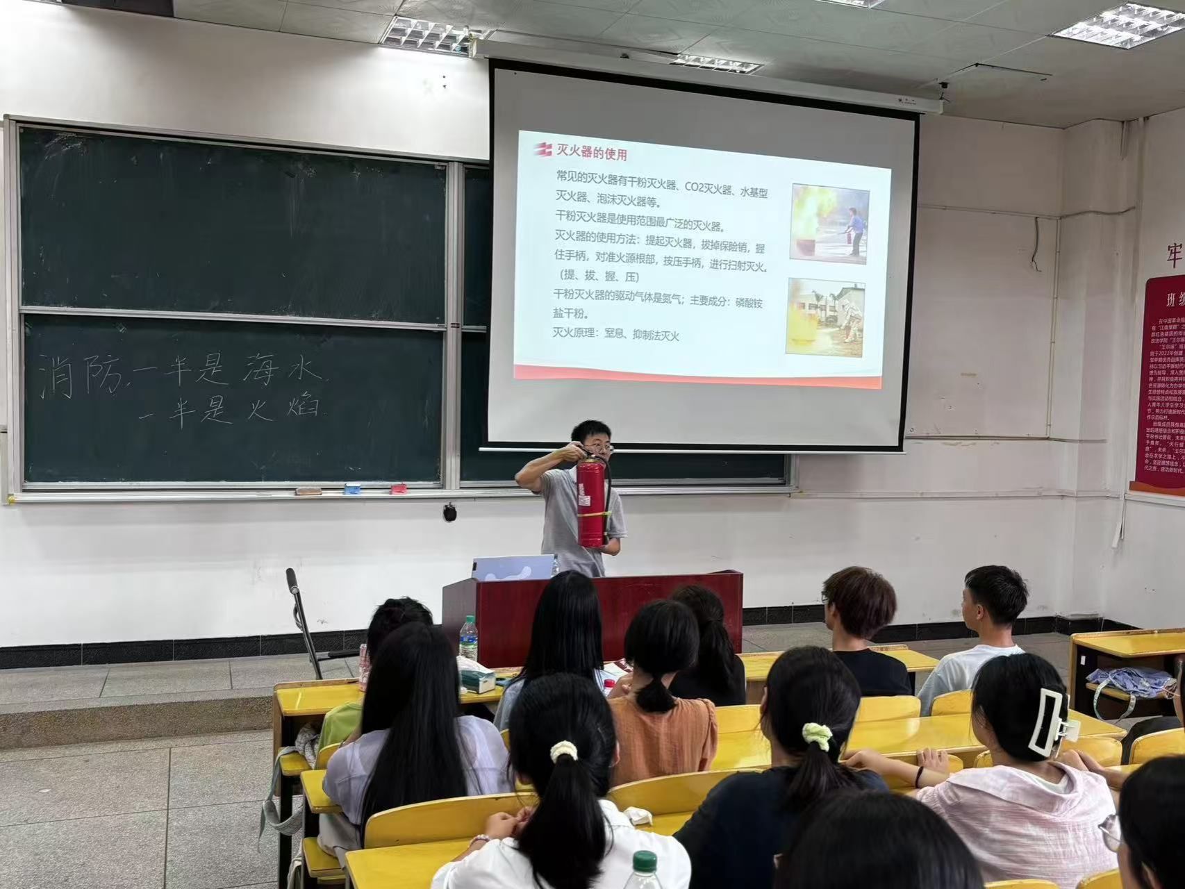 讲座中,肖文海根据校园消防安全工作规律及特点,以校园典型火灾事故案例为切入点,深入浅出地讲解了引发校园火灾的原因、日常火灾预防措施以及需要注意的消防安全细节。此外,在“消防设备与设施介绍”环节中,为让新生们更加直观地了解消防器材的使用,肖文海在课堂上现场讲解并演示如何使用灭火器。最后,通过“一问一答”的形式,肖文海重点对如何扑救初期火灾、如何快速安全逃生自救等消防安全知识进行宣传普及,让消防知识真正走进新生心中。