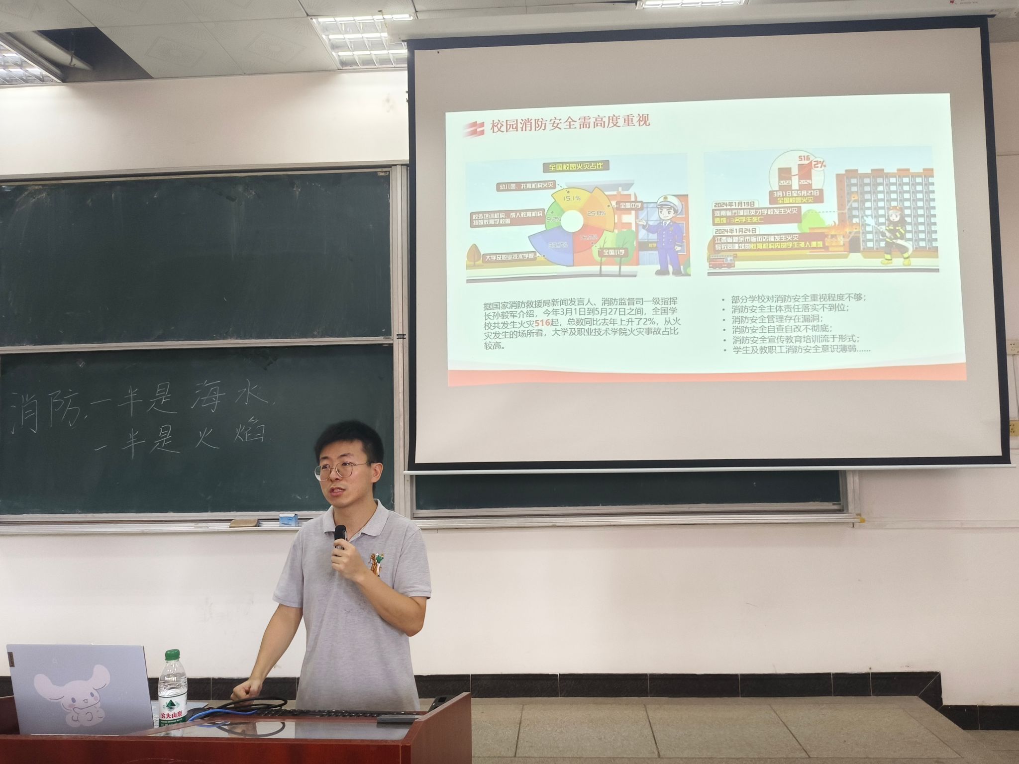 为提升2024级新生消防安全意识和避险自救能力,筑牢校园消防安全“防火墙”,9月7日上午8时20分,政法学院于5栋407、408教室开展2024级新生消防安全入学教育活动。政法学院团委副书记、学生科副科长肖文海担任主讲人。