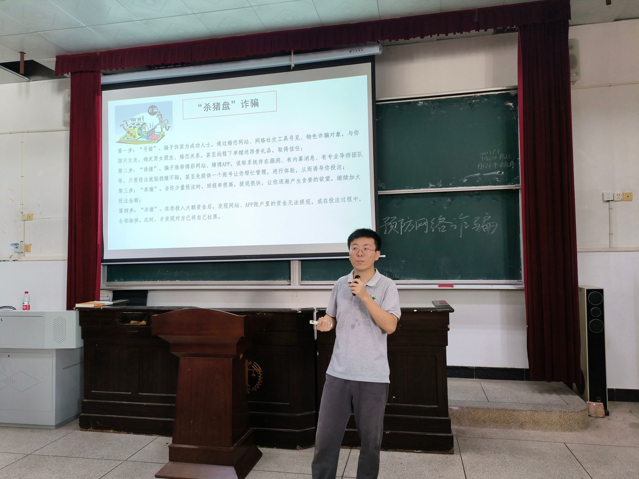 为切实提高学生财物安全意识,有效防范诈骗、传销及校园网贷骗局,9月7日下午2时30分,政法学院团委副书记、学生科副科长肖文海于5栋408教室开展了以“防诈骗、防传销、防校园网贷骗局”为主题的网络安全教育课,政法学院2024级全体新生参与。