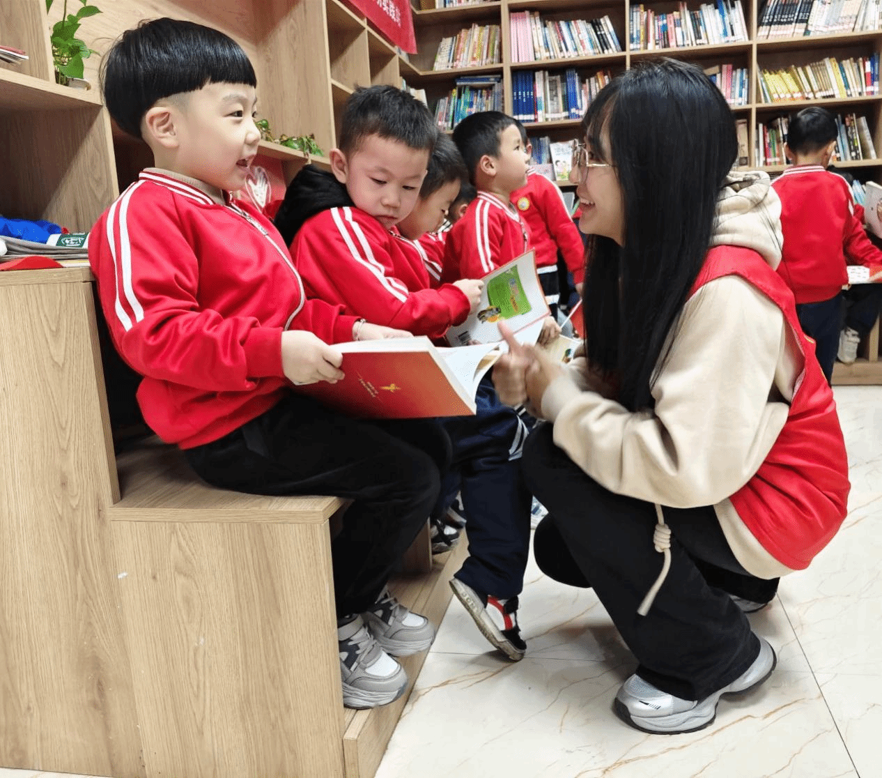 在阅读室中,志愿者们则用充满感染力的语言讲述了董存瑞、王二小等英雄人物的感人事迹,引导小朋友们珍惜当下的和平幸福生活,鼓励他们学习并传承革命先烈的伟大精神。