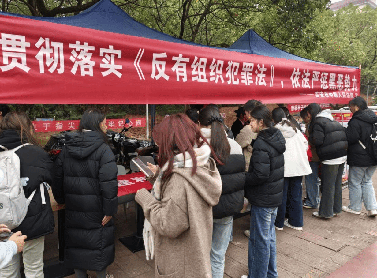 活动现场布置得井然有序,吉安中院干警和志愿者们通过悬挂横幅、设置普法展板、发放宣传手册等多元形式,向途经的同学们阐述常态化扫黑除恶相关规定和《中华人民共和国反有组织犯罪法》相关内容,并引导同学们在宣传横幅上签名。同学们热情高涨,积极参与,纷纷表示此次活动让自己更加了解了扫黑除恶的相关政策法规。
