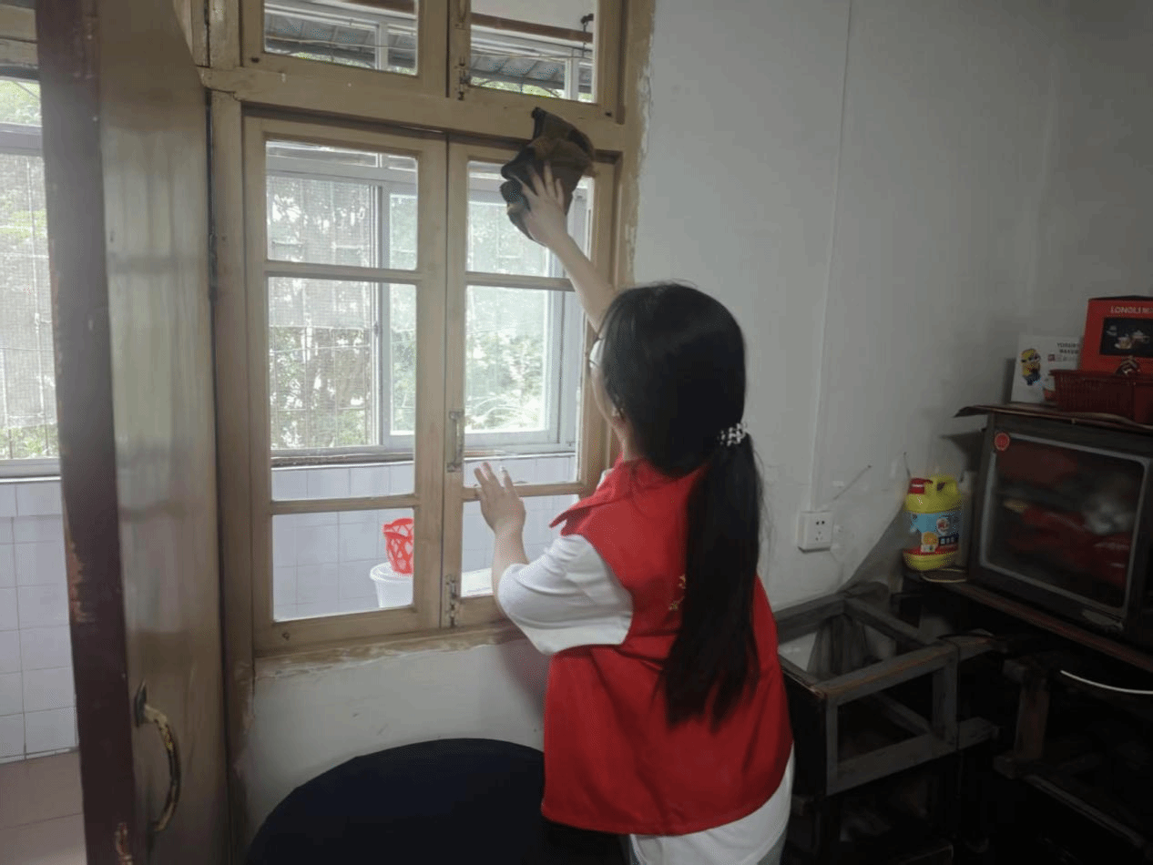 活动当天,志愿者们身着统一红马甲,分成三个小组,在社区工作人员的带领下,有序前往老人的家中。志愿者们在与老人们亲切问候后,随即开展志愿服务工作,帮助老人们整理杂物、打扫卫生,改善居家环境;与老人促膝交谈,关心他们的身体状况和生活情况,耐心倾听老人们讲述过往经历,给予心理关怀与陪伴。戴水英老人还热情地从衣柜深处取出珍藏的旗袍,并介绍它的制作工艺、保存历史等内容。志愿者认真倾听,并与老人一起细细端详旗袍上精致的花纹、柔软的布料和细密的针线。