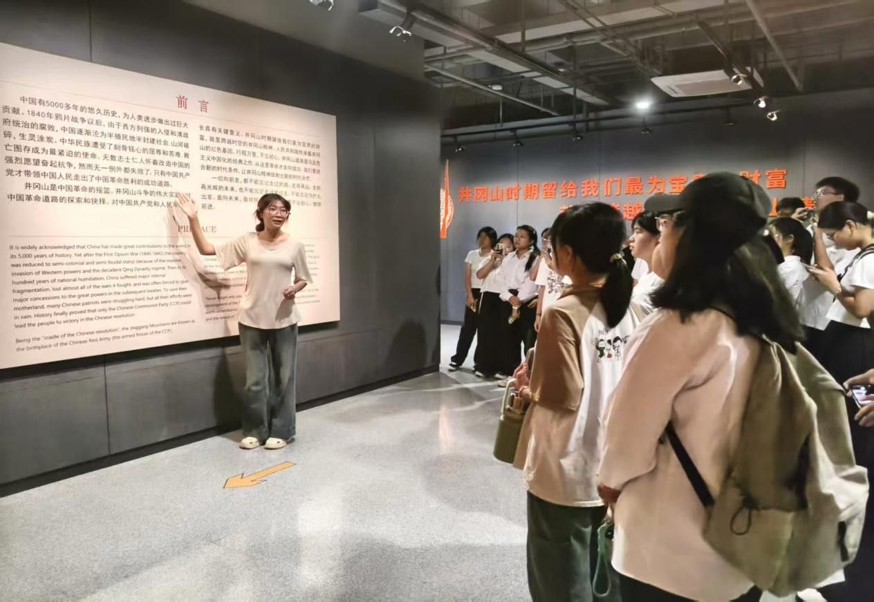 在“挑粮小道”模拟场景与沉浸式体验区,同学们通过实景感受,亲身领悟革命先辈穿草鞋、睡稻草、吃红米饭南瓜汤的艰苦生活,在声光电交织的场景中重温黄洋界保卫战的激烈壮阔。一件件实物承载岁月记忆,一幅幅画面还原历史场景,让书本上的文字变得鲜活可感,使“坚定执着追理想,艰苦奋斗攻难关,实事求是闯新路,依靠群众求胜利”的井冈山精神内涵深深镌刻在学子心中。