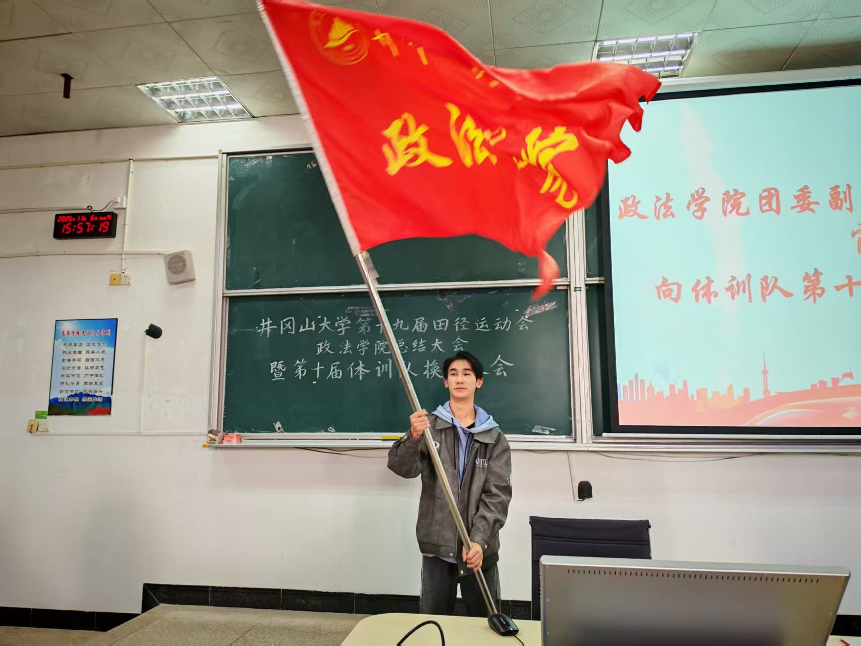 会议伊始,全体起立,奏唱共青团团歌。政法学院第九届体训队队长闵静远首先作工作总结,全面回顾运动会的筹备组织,赛事开展及成果亮点。随后,优秀运动员海沙尔·海拉提分享了参赛感悟,他感谢学院支持与团队力量,并鼓励全体队员继续拼搏,夯实训练,力争在未来赛事中再创佳绩。肖文海对运动会中表现突出的先进集体及个人、优秀运动员进行表彰。林福琴宣读了第九届体训队正式队员及第十届候选队员名单,欧阳蓓为第九届体训队队长闵静远、副队长包宇、姜红霞颁发证书。紧接着,肖文海向第十届体训队队长周宇航授旗,周宇航带领体训队全体成员宣誓,表达新一届队伍的决心与信念。最后,肖文海对第十届体训队提出殷切期望,勉励新一届队伍继承优良传统,刻苦训练、团结拼搏,在未来的赛场上续写政法学院体育新辉煌。