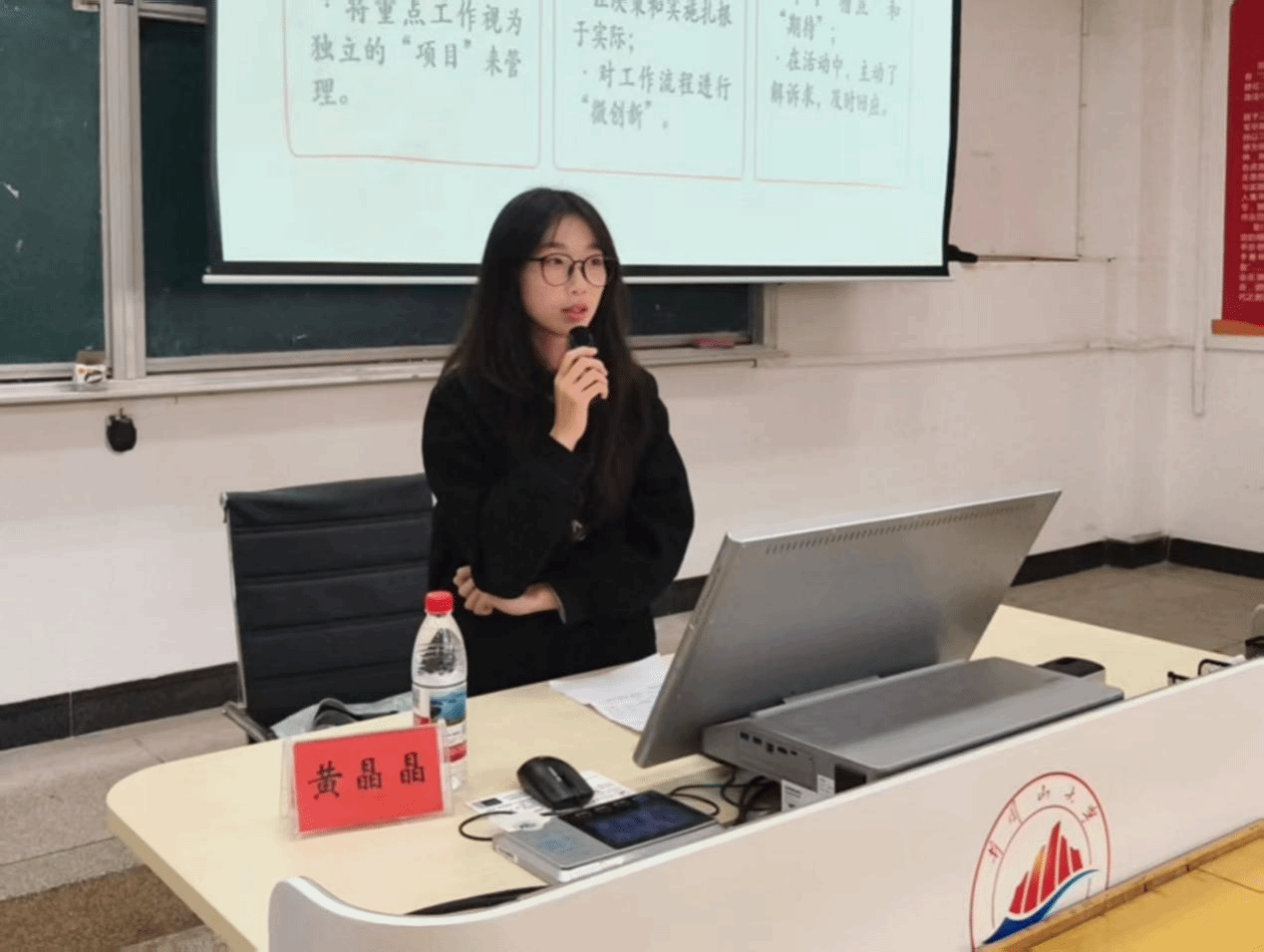 活动伊始,黄晶晶首先向全体成员系统梳理和介绍了党的二十届四中全会的基本情况与重大意义。她指出“十五五”时期作为承前启后的关键阶段,是我国基本实现社会主义现代化夯实基础、全面发力的重要时期。她解读了“十五五”时期经济社会发展的指导思想、主要目标和必须遵循的“六个坚持”基本原则。围绕全会精神的贯彻落实,她重点解读了“学思践悟”的实践路径,即通过深入学习文件、思考转化、积极实践和总结提升四个环节推动工作落地。谈及工作能力时,她提出要着力强化四项核心能力:增强政治素养与理论武装,提升专业技能与办公水平,掌握科学实践方法并加强主动汇报,以及促进团队协作、形成工作合力。最后,她号召全体学员将学习成果转化为推动工作的强大动力,以青春之我、奋斗之姿践行使命担当,为实现国家治理体系和治理能力现代化贡献青年智慧与青春力量。
